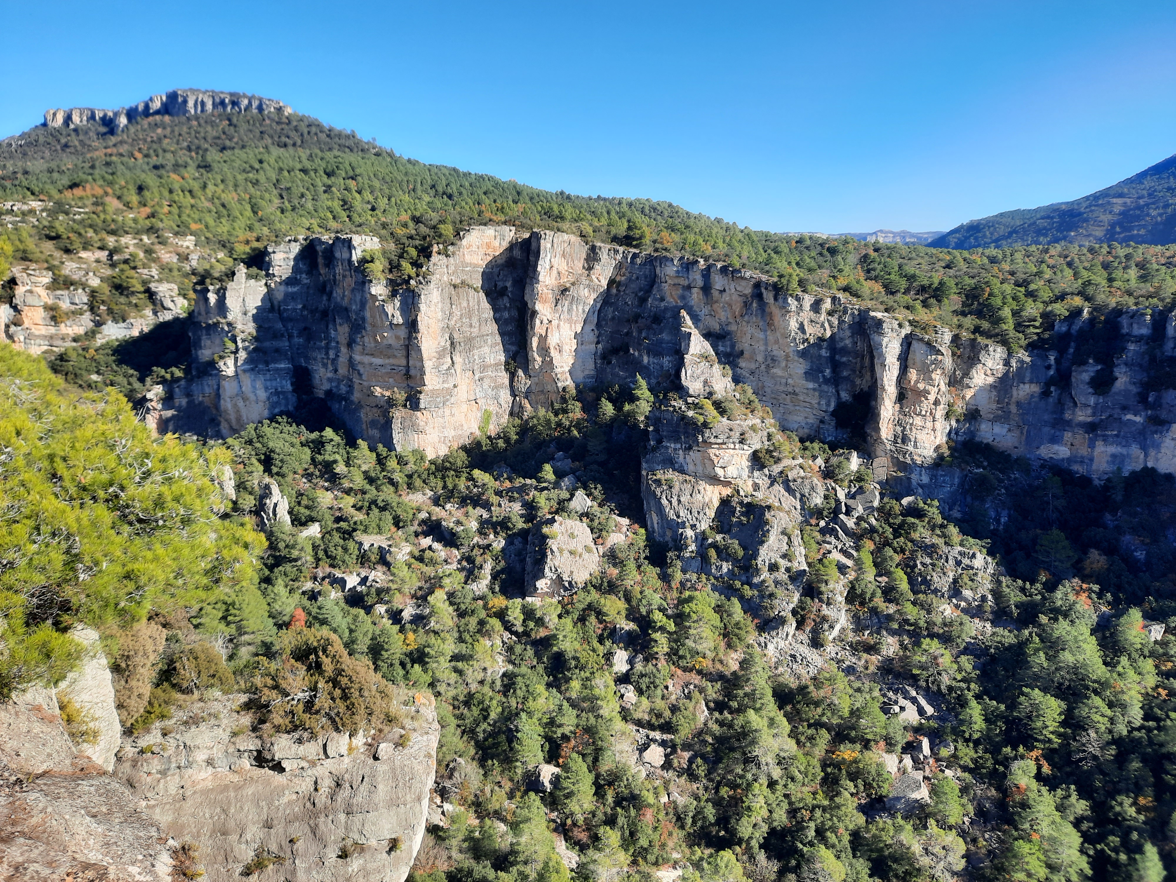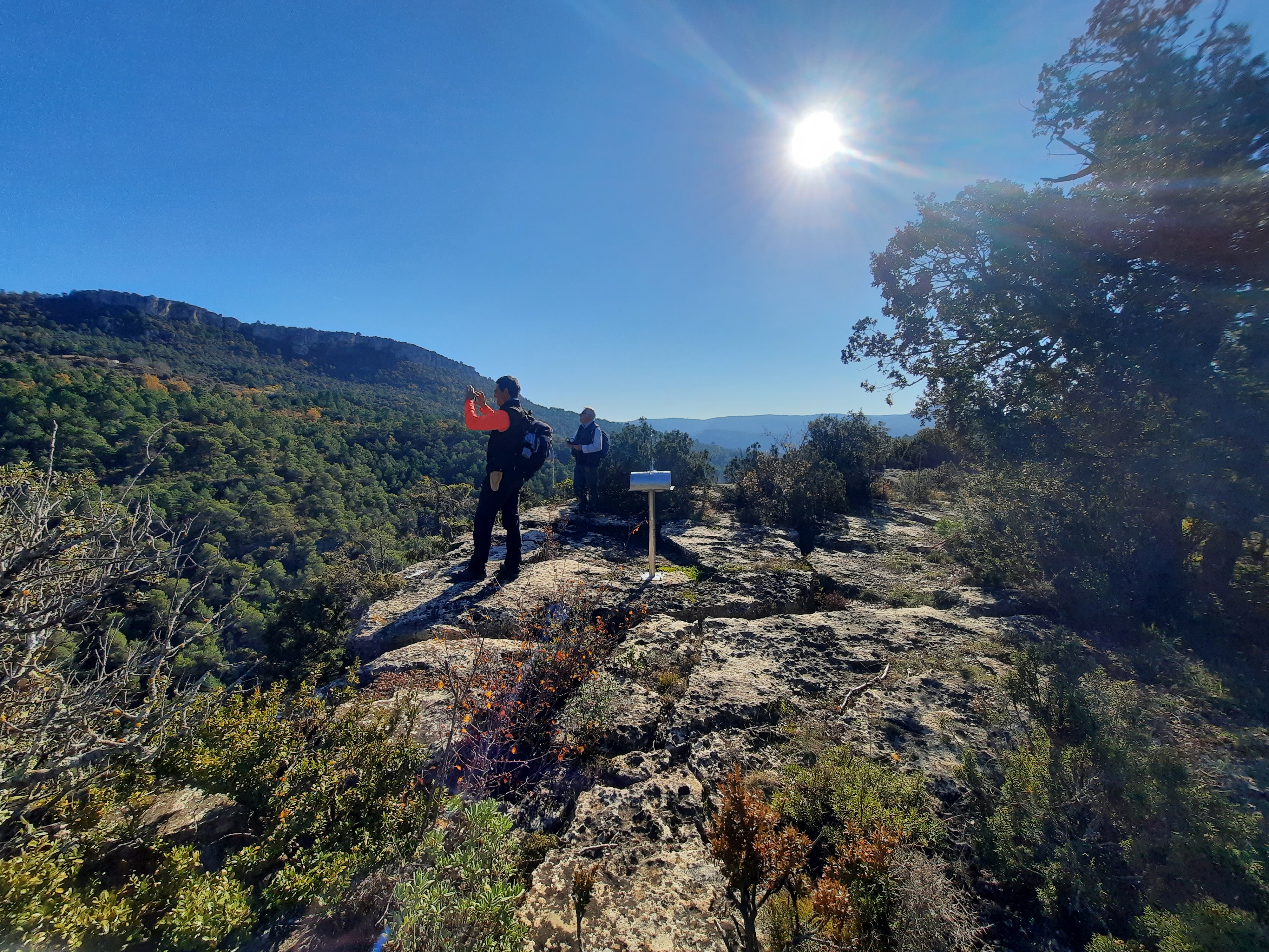 Seguint pel sender que veníem del Mas d’en Gravat, al cap de 170 m., deixem el sender per anar a guaitar a un mirador sobre el barranc del Carcaix i del Riu Siurana,