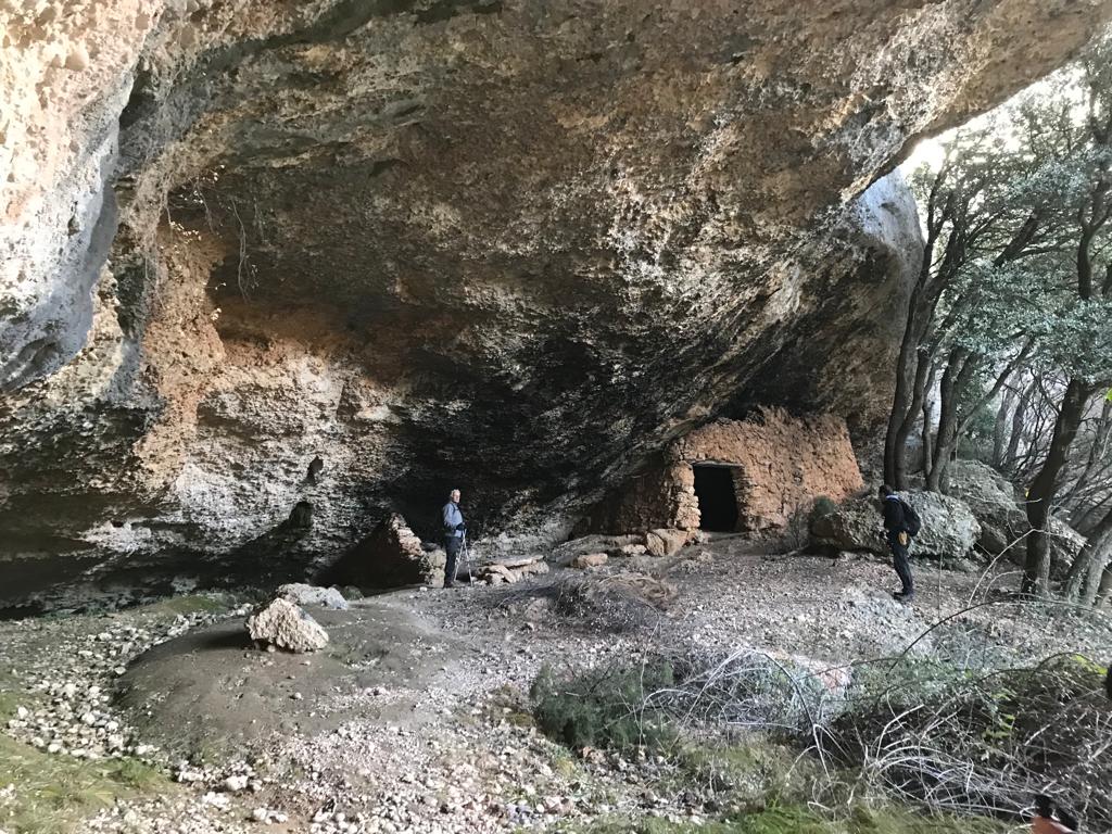 Tornem a sender i seguim baixant, en 250 m., arribarem a la Cova del Serret, es tracta d’una balma amb una petita construcció i d’on hi ha un brollador d’aigua al sostre.