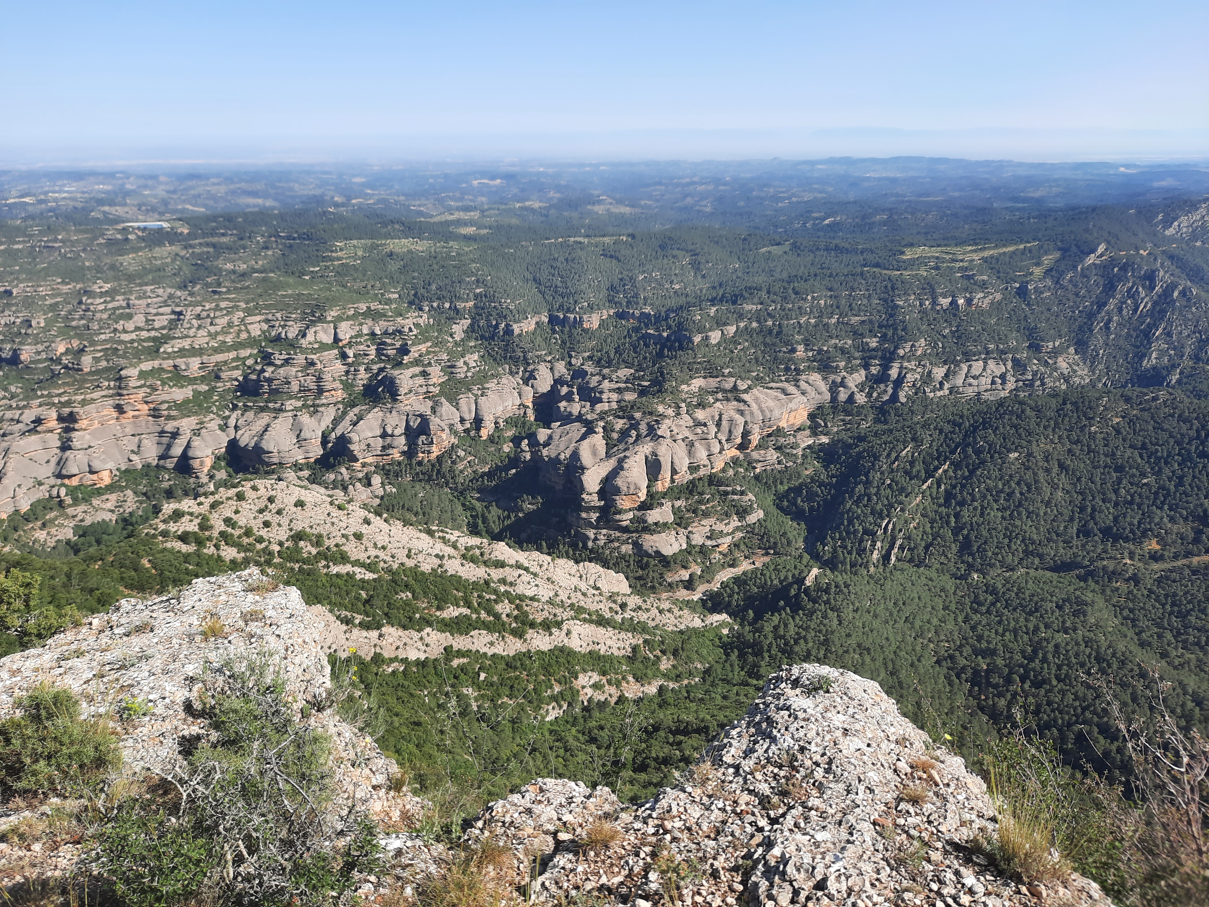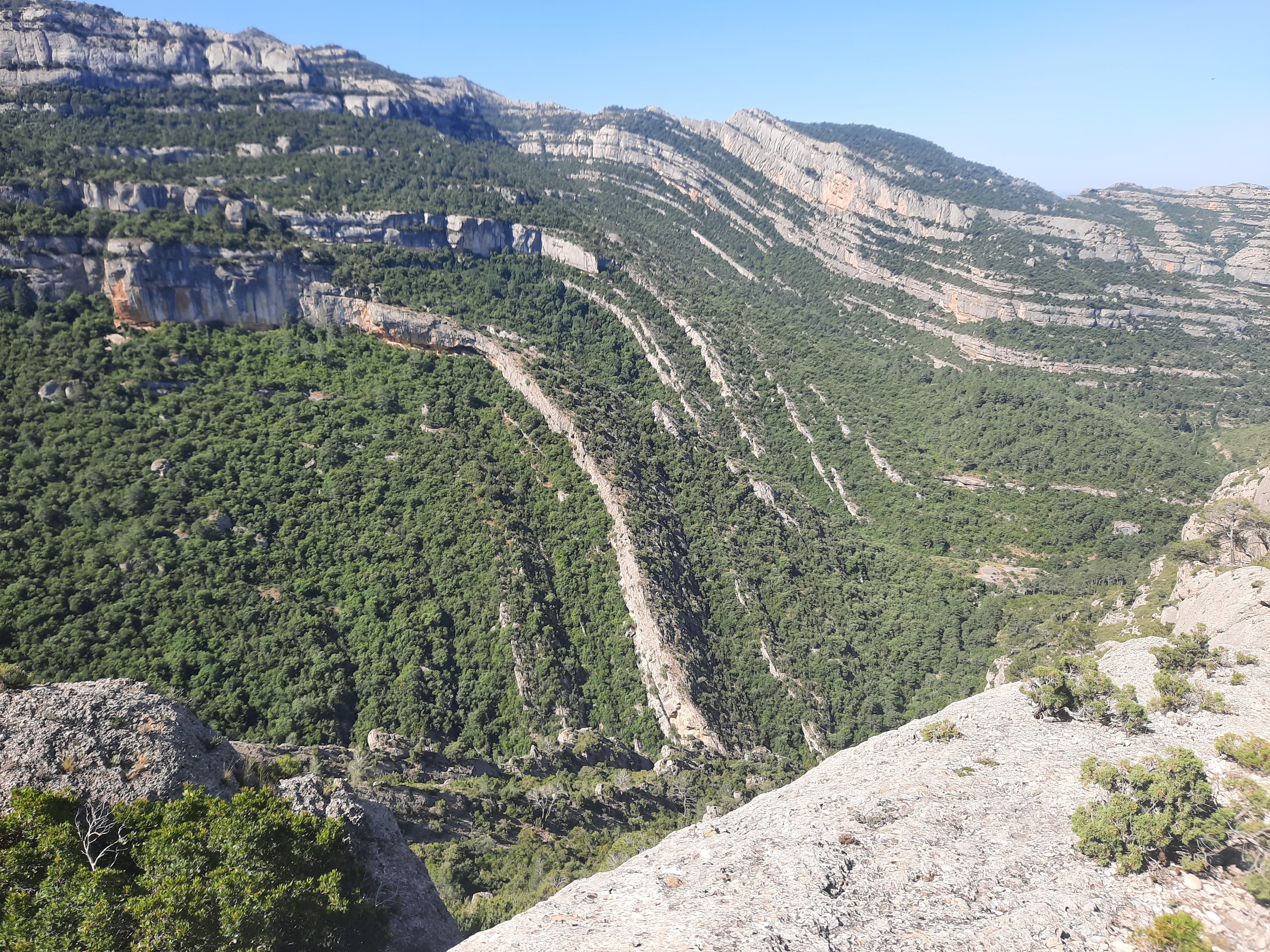 Seguim pel sender carener, que a partir la Punta dels Pins Carrassers ja comença a baixar, anem direcció al sender que passa pels Ventadors, amb el barranc dels Pèlics a l’esquerra, amb vistes de la Llibreria, el Pont Natural, l’Engolidor,… un espectacle visual, cal anar vigilant, hi ha algun punt on en cas de caure podria ser perillós.