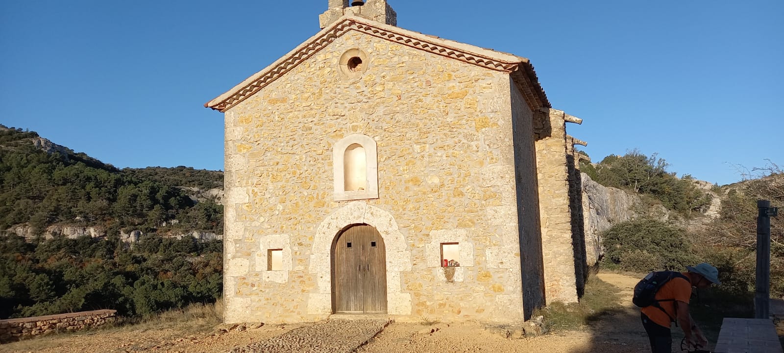 creuem el barranc del Teix, i a 800 m, trobarem, a l’esquerra el sender del “Grau de la Mare de Déu, 300 m desnivell, 1 km., 30’”, agafem aquest sender, al principi puja suaument, però es va empinat força. Al cap d’1 km., arribem a l’Ermita de la Mare de Déu de Montsant, un bon lloc per començar a contemplar el paisatge.