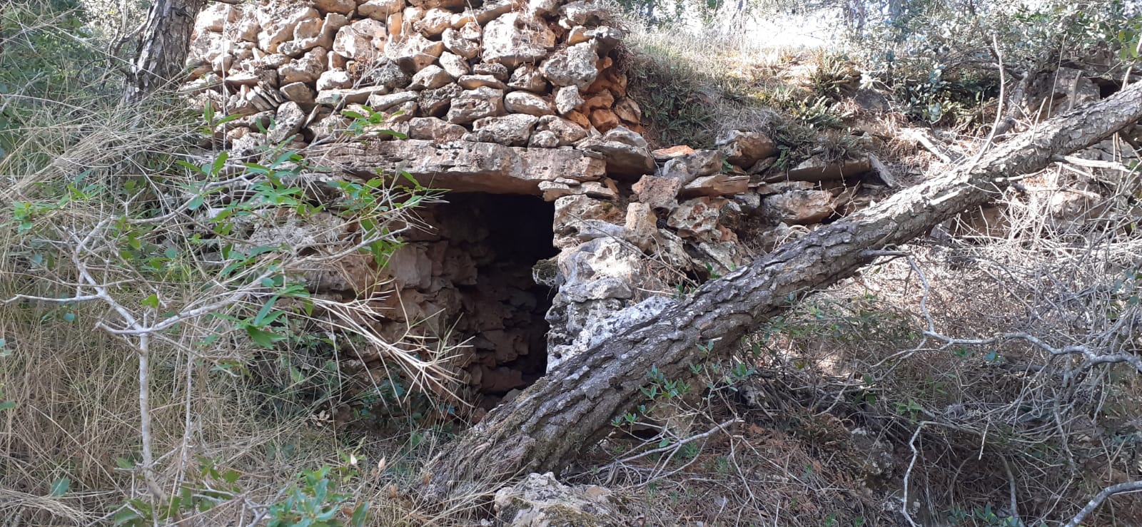 Tornem al sender, baixa uns metres per creuar un barranc i desprès puja suaument, primer serpentejant per esquivar la vegetació, i desprès encaixonat entre marges de pedra, passats uns 2 km., arribarem a la caseta de Ca l’Eloi, una de les casetes de pedra seca més grans de la zona, amb un contrafort a la part oest, amb parets de 90 cm. de gruix, al voltant de la caseta hi ha molts marges de pedra seca i un cocó d’aigua, un veritable patrimoni de pedra seca.