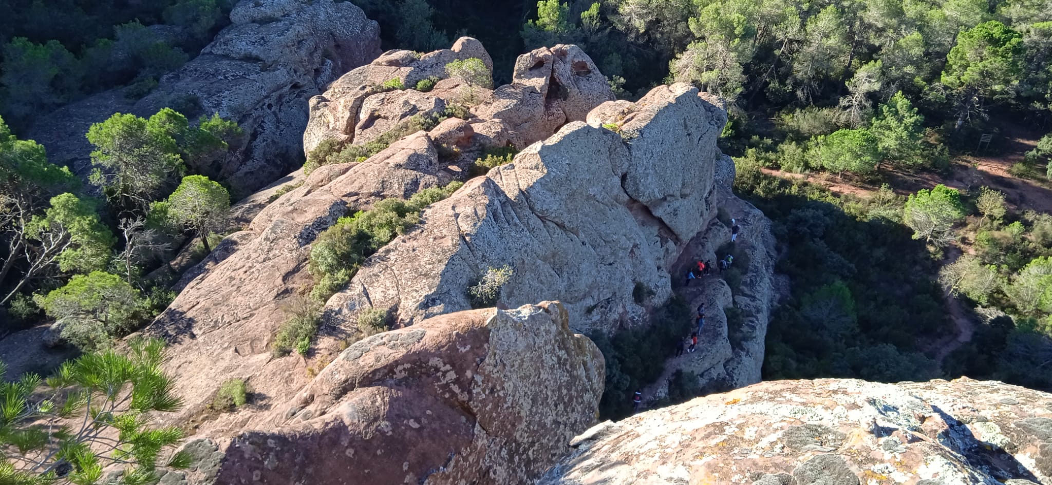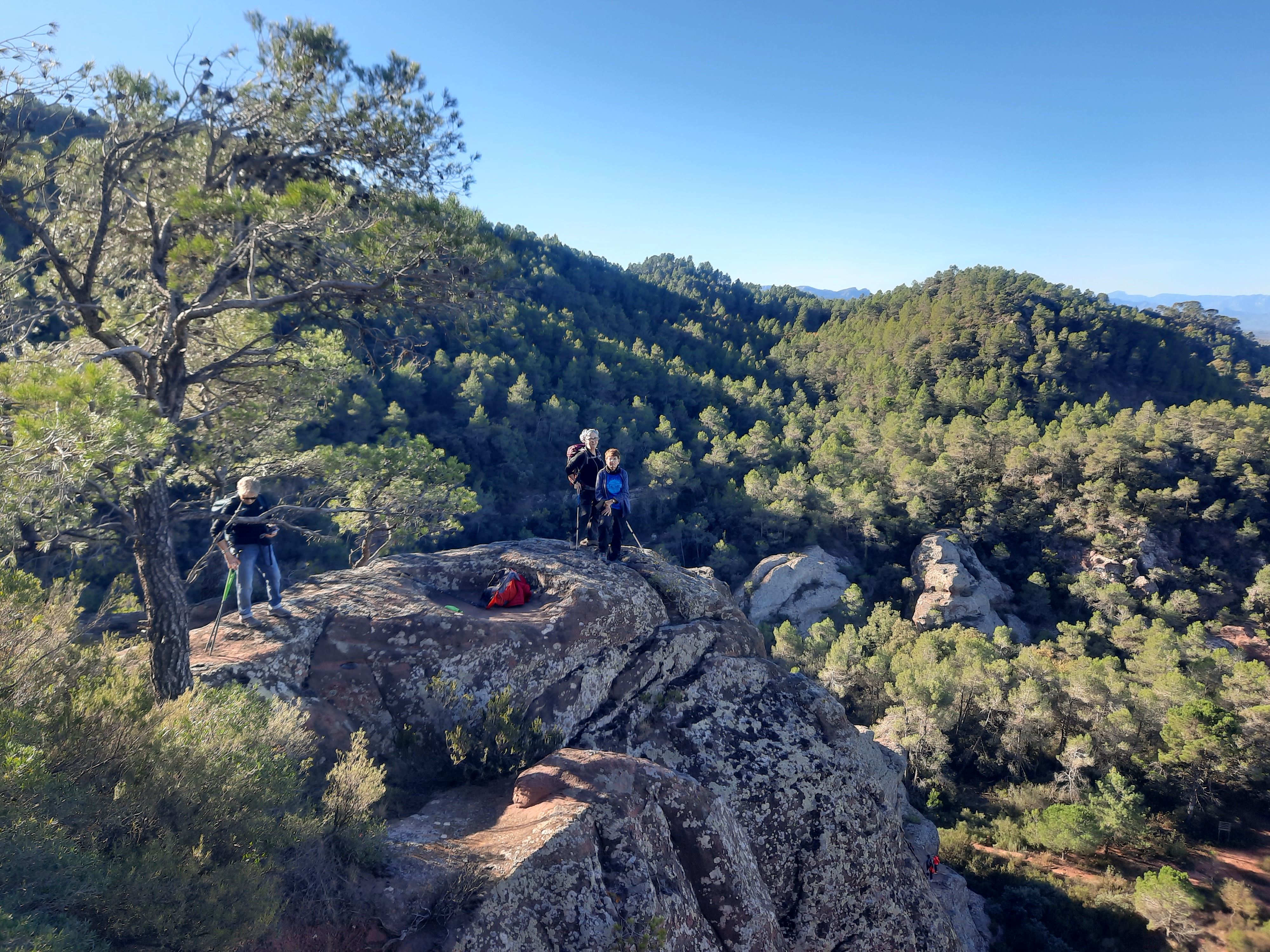 Al cap de uns 100 m., de deixar el sender, arribarem a una gran aflorament inclinat de pedra arenosa vermella, vigileu si està humida que rellisca molt, podeu baixar pels racons. Seguint el track, al cap de 150 m. arribarem a una roca a sobre mateix de l’ermita de Sant Gregori, amb bones vistes dels voltants de l’ermita i dels Racons.