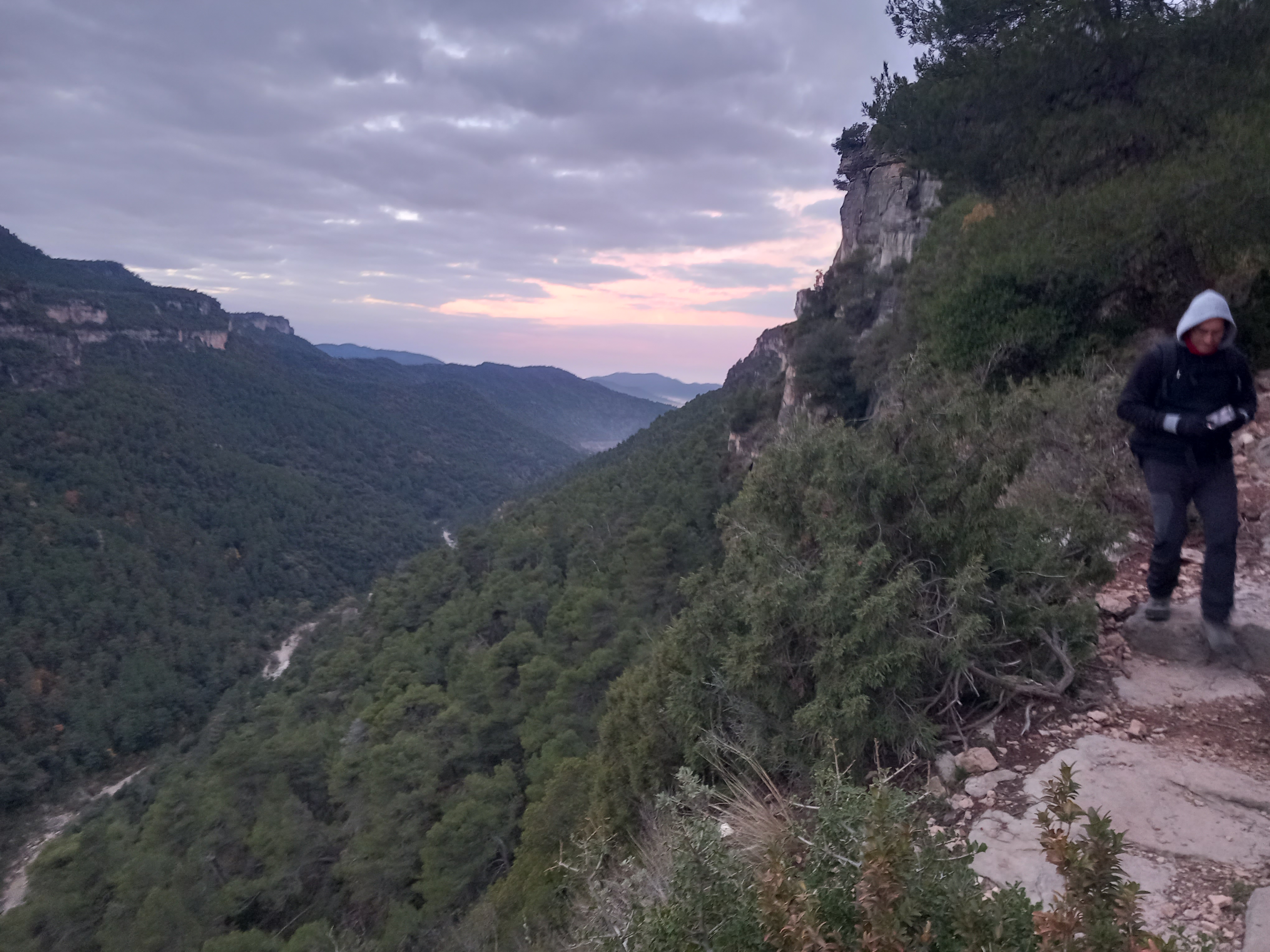 Tornem al camí i seguim 1,5 km., fins que trobarem un sender que baixa de Gallicant (de l’esquerra), travessa el camí, l’agafem a la dreta, el sender va baixant cap al Grau del Bodro, a mitja baixada trobarem una cruïlla de senders que a l’esquerra ens portaria a la Cova Tosca, Arbolí, seguim a la dreta, baixem i creuarem el riu, arribarem al Mas d’en Candi, on agafarem el camí a la dreta, direcció al Molí de l’Esquirola, caminarem 50 m. pel camí i trobarem un sender a l’esquerra, que agafarem deixant el camí, el sender s’enfila a buscar les parets del cingle, la primera part no està molt transitada, encara hi ha molts trams empedrats, quan trobem les primeres parets, el camí està molt més net, i freqüentat per escaladors, som al Grau del Maset del Placero, hi ha racons molt bonics. El sender arriba al camí, pel que hem vingut a l’anada, l’agafem a l’esquerra, passem pel costat d’un corral de cabres i arribem al camí de Siurana a Prades lloc on hem començat la caminada.