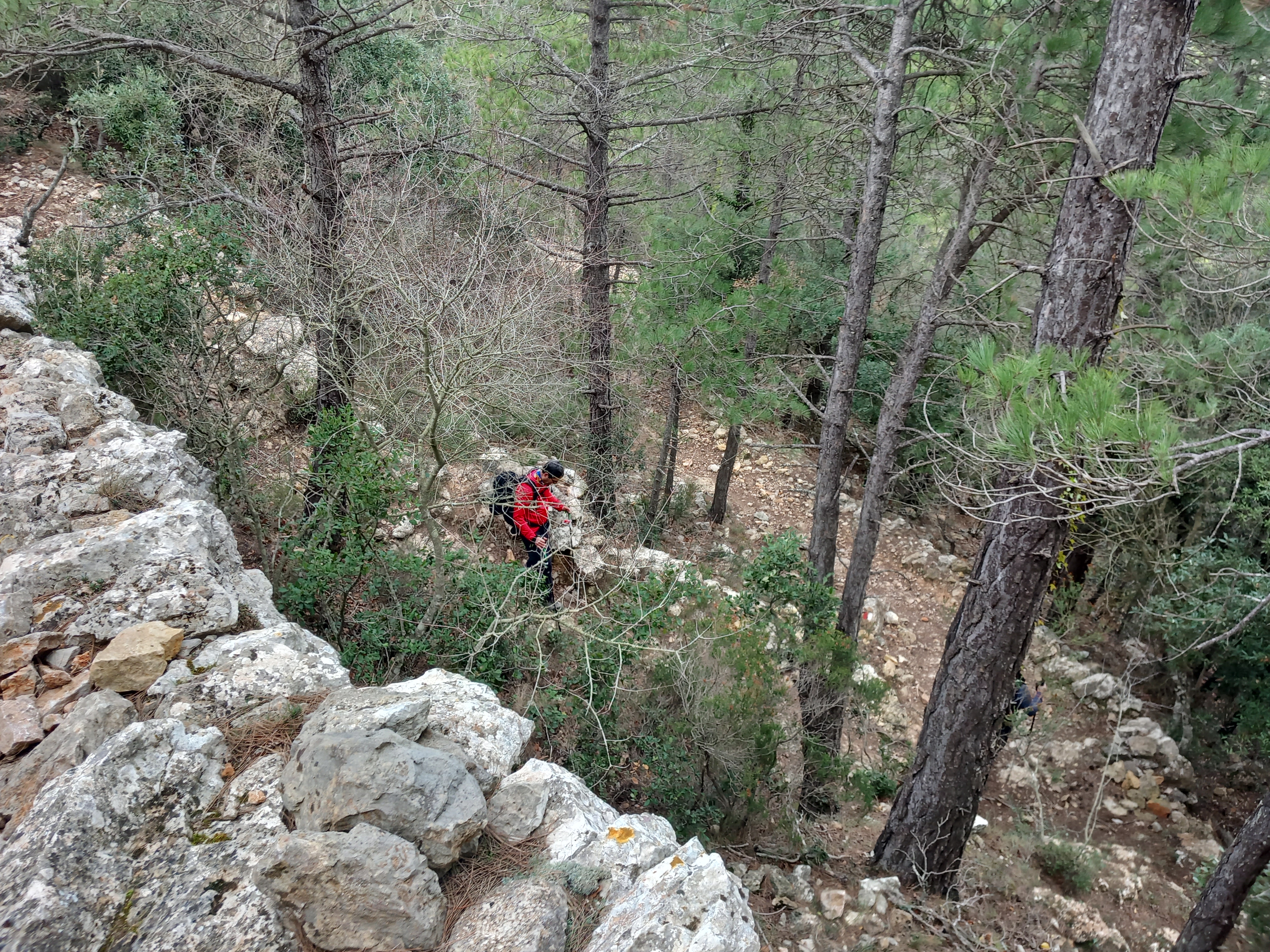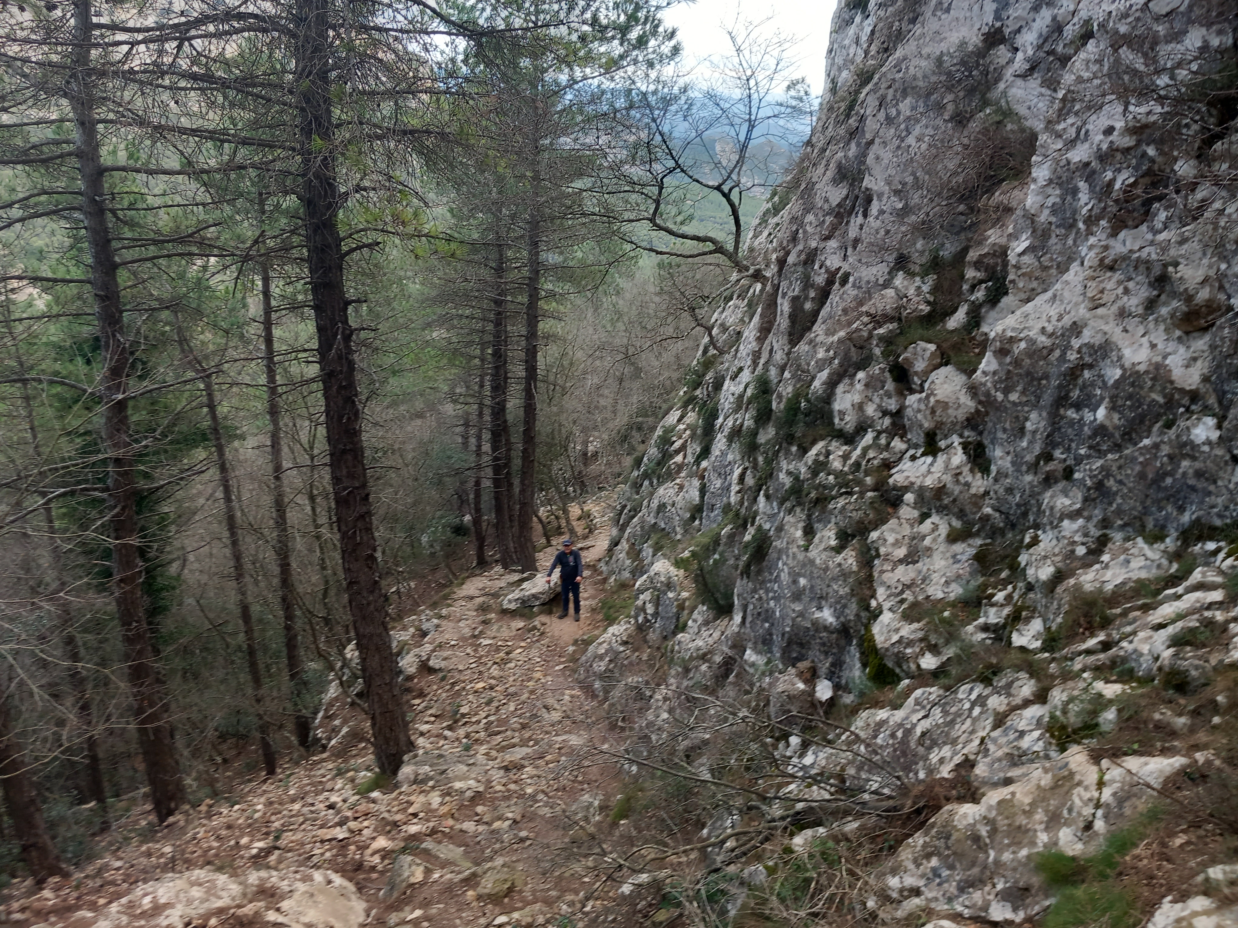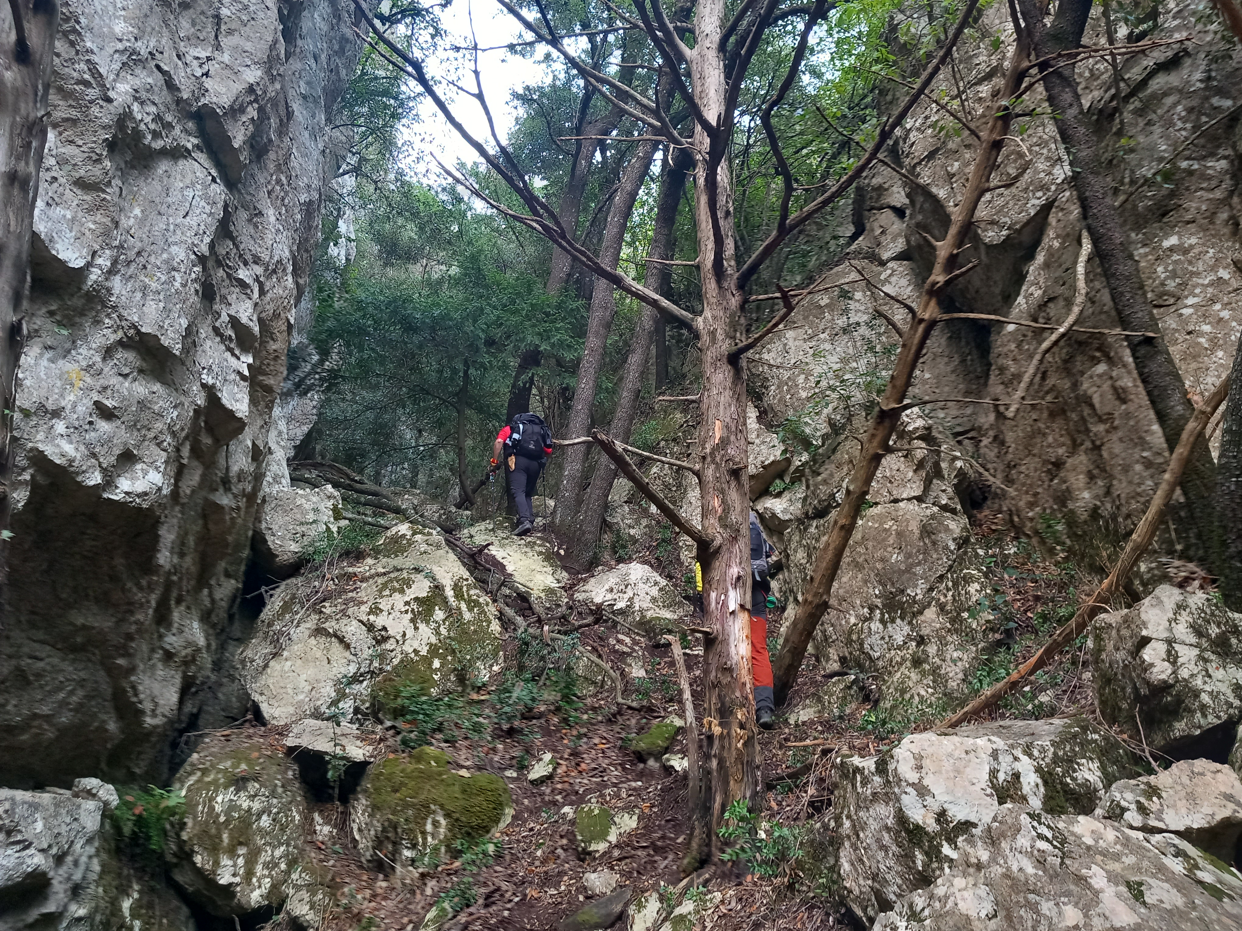 Seguim pel sender, ara fa pujades i baixades, esquivant cingles de roca, al cap de 400 m., encara la Rasa dels Teixos, per la que pugem sentint-nos com a formigues dins una esquerda.