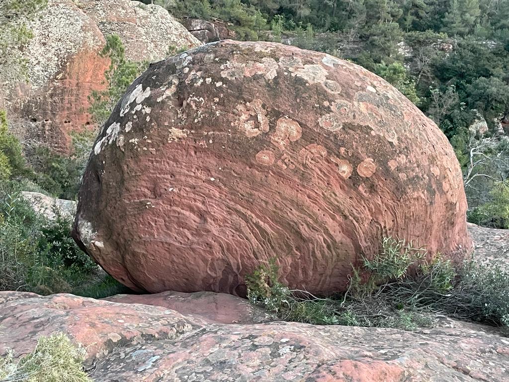 Un cop a dalt, ens trobarem un sender poc transitat, baixem cap al barranc que remuntarem, per arribar al cap de uns 100 m., a una cova on hi ha unes lletres “ FYM”, seguim, arribarem a sobre de roques, aneu cercant racons i formacions geològiques sortim fent una segona grimpada per una altra roca, un cop a dalt girem a l’esquerra, per anar per més racons i miradors, passem per una roca que recorda a un caragol.