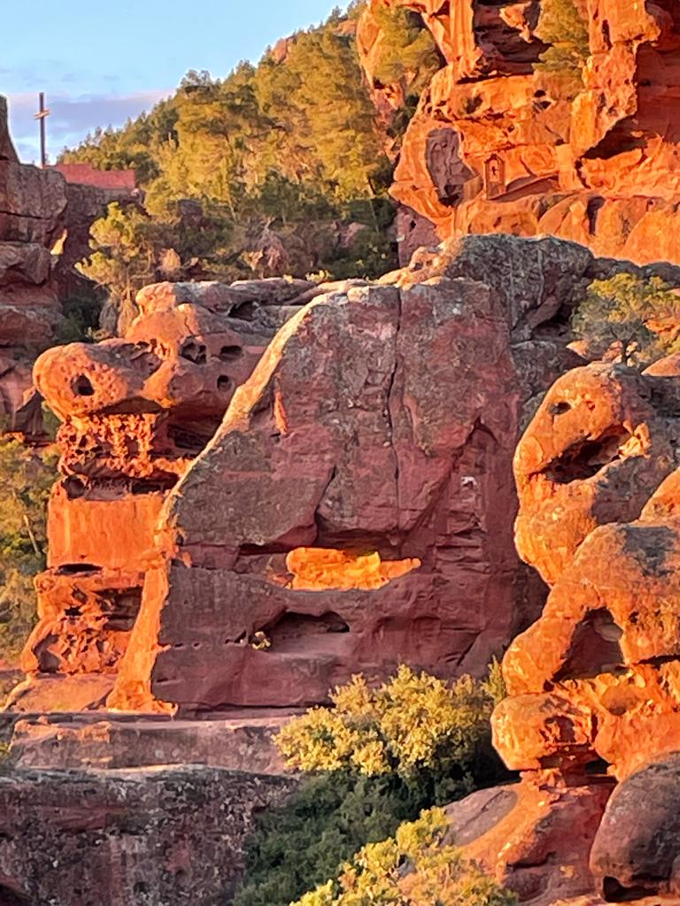Al arribar al final sortirem cap a la dreta, per un sender que ens portarà a l’antic camí de La Torre de Fontaubella, agafem el camí a l’esquerra durant uns 200 m., fins que arribem a la Creu de Terme, on agafem el camí de l’esquerra, al cap de 60 m., el deixem per agafar un sender, al cap de 250 m., trobarem un sender a l’esquerra, sense senyalitzar, és una drecera per anar a Sant Gregori, l’agafem, en 150 m. sortim del sender per anar a un primer mirador on podem admirar tota la zona, als voltants de sant Gregori, amb roques arenoses vermelles amb formes capritxoses.