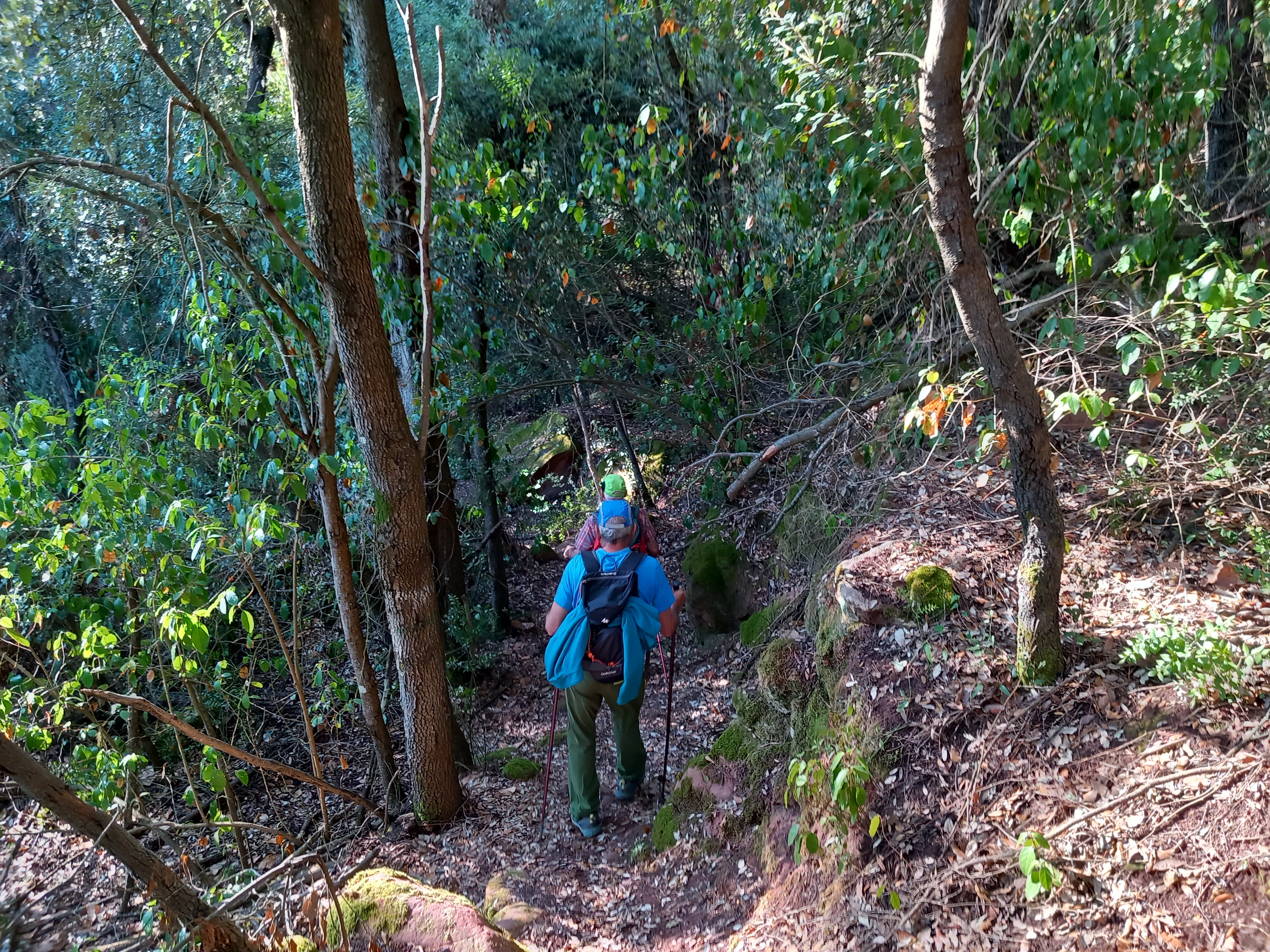 El sender aviat puja un marge i s’endinsa al bosc, entrem a la part baixa del barranc de l’Estret de Catà, som dins un bosc tancat, ombrívol, de conte de fades, ple de molsa, falgueres, follets i bruixes (be, això últim dependrà de la companyia que porteu),