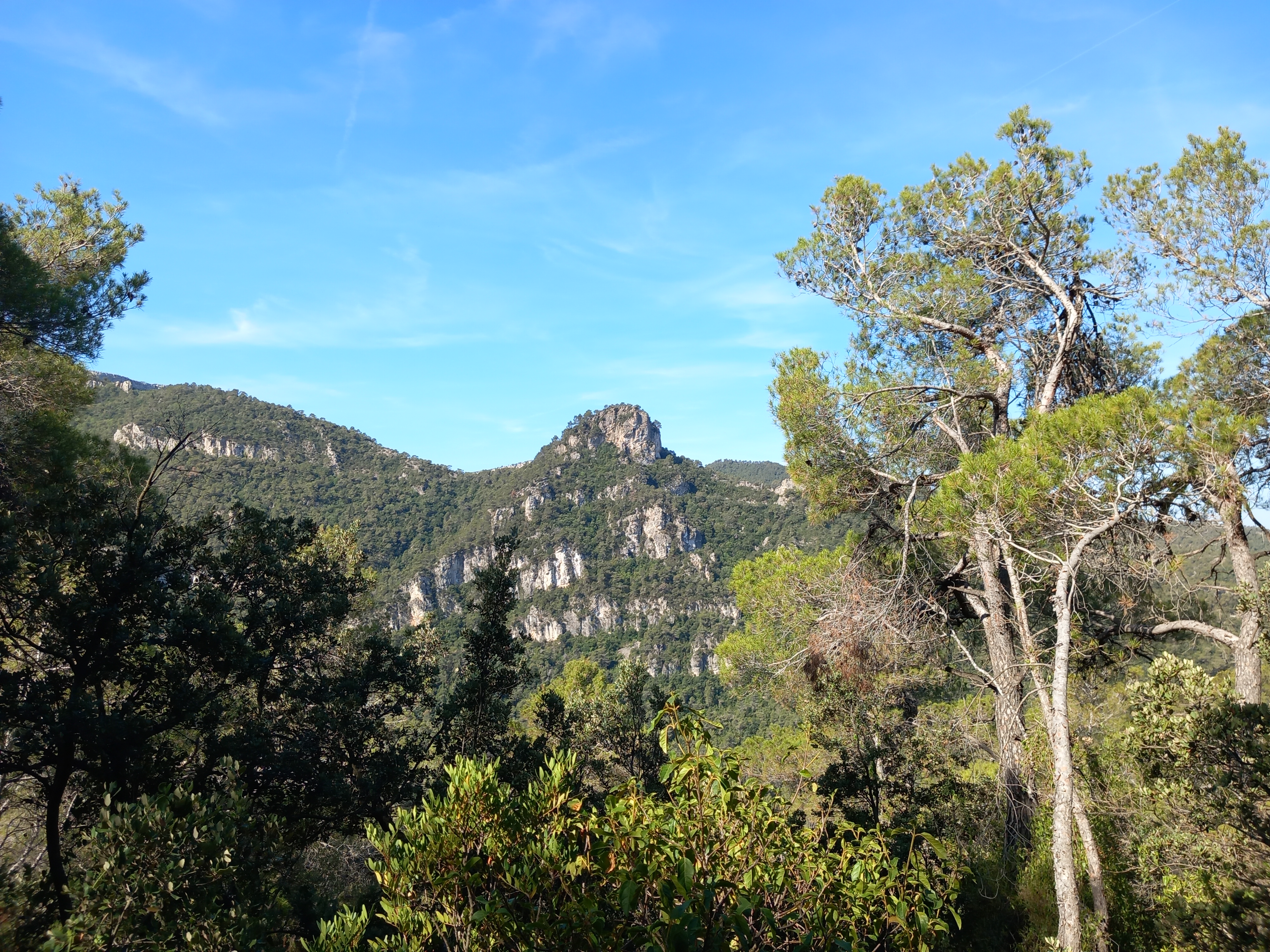 Comencem a pujar un fort pendent, aviat passem per una barraca de pedra seca, la pujada es suavitza quan arribem a la carena, quan portem un km de pujada, arribarem al sender que rodeja els peus dels cingles de la Mola, som a sota de la Punta de Baix de la Mola de Colldejou, aquest sender, a la dreta, ens portaria al coll del Guix per sota de l’Ull de Bou, a l’esquerra cap a la part baixa de la Canal Fosca.