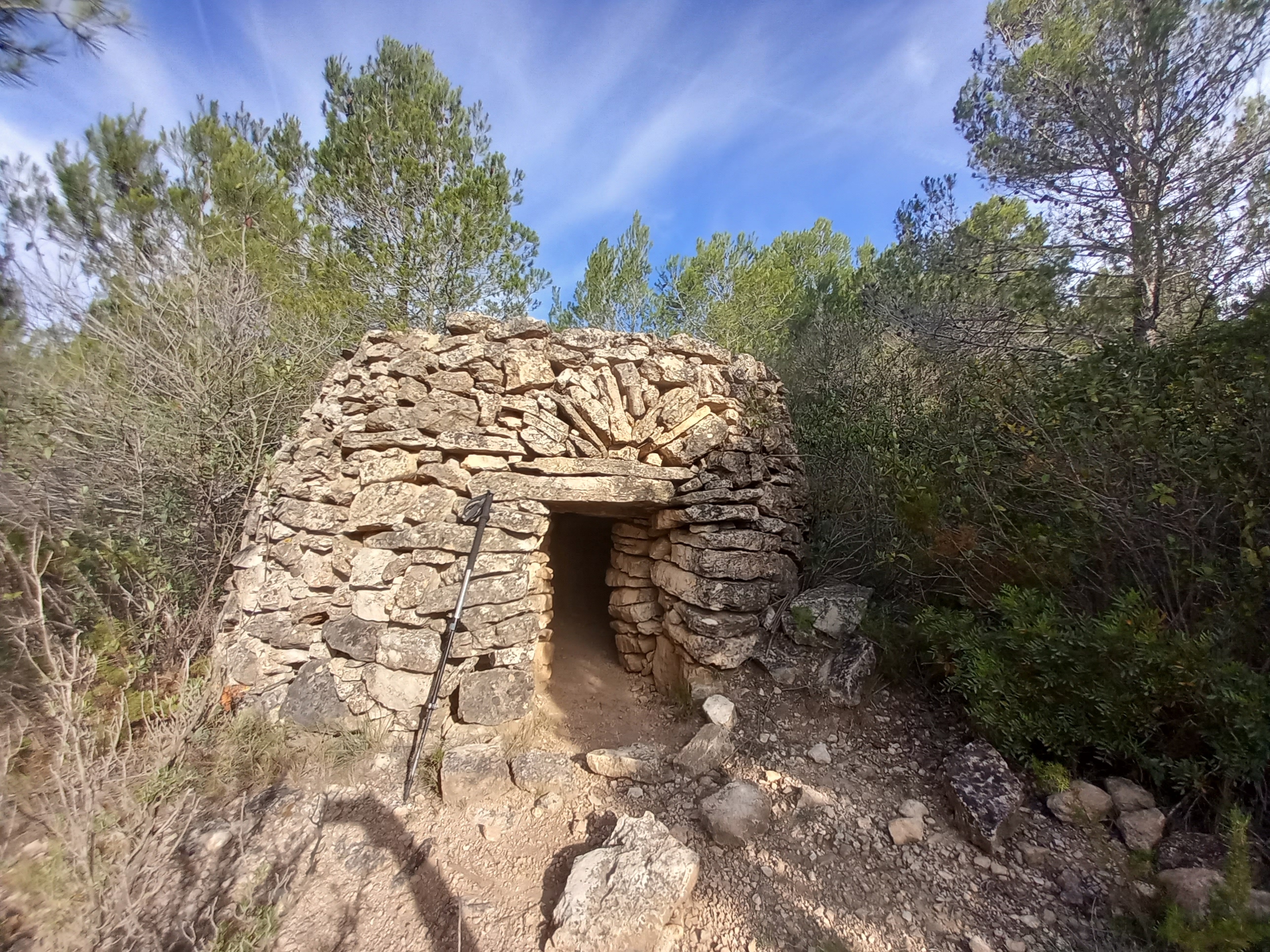 Tornem al sender i seguim, a 100 m trobarem un indicador a la dreta que ens porta, en 100 m., a una obra d’enginyeria rural, una caseta de pedra seca, admirable. Seguim, en 100 m. entrem a un sender a l’esquerra que ens porta a una altra construcció de pedra seca, aquest cop, encastada a un marge, tornem a sender