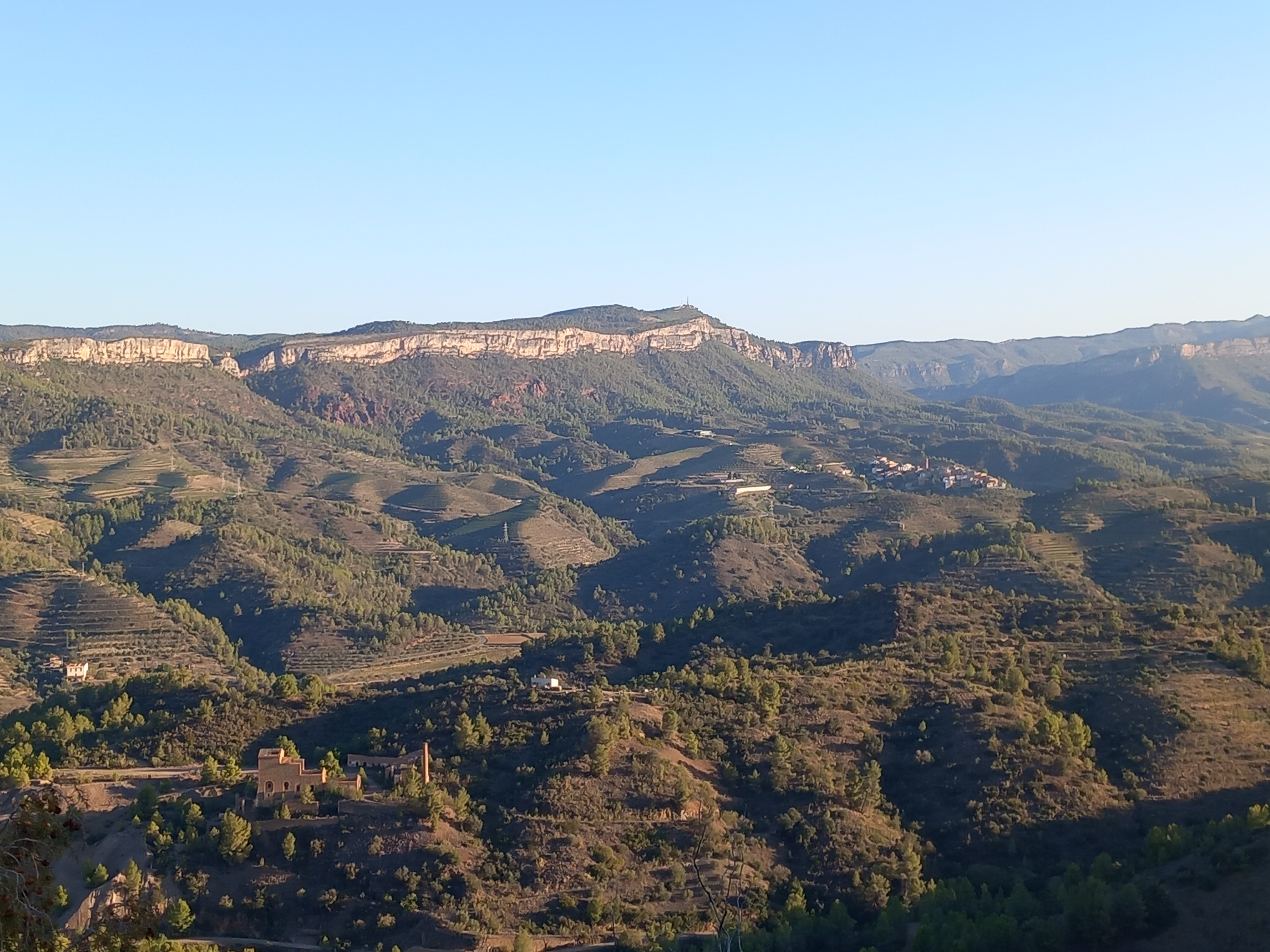 A l’altre costat del bancal hi ha una petita caseta de tros, passem per davant de la porta, pugem uns pocs metres, trobarem un sender, és l’antic camí de Bellmunt al Masroig, l’agafem a la dreta, passats uns 200 m. arribarem a una cruïlla de senders, ja hi hem passat abans, on hi ha cartells indicadors, giraren a la dreta, direcció a “Mina Eugenia, Bellmunt del Priorat” el sender baixa, per arribar en 350 a unes vinyes, som a les Terres Banques, agafarem el camí que baixa a l’esquerra i abans de 200 m., arribarem al camí de les Boves Fresques, per on ja hem passat anteriorment, que agafarem a la dreta, on refarem el camí ja fet per arribar al punt de sortida.