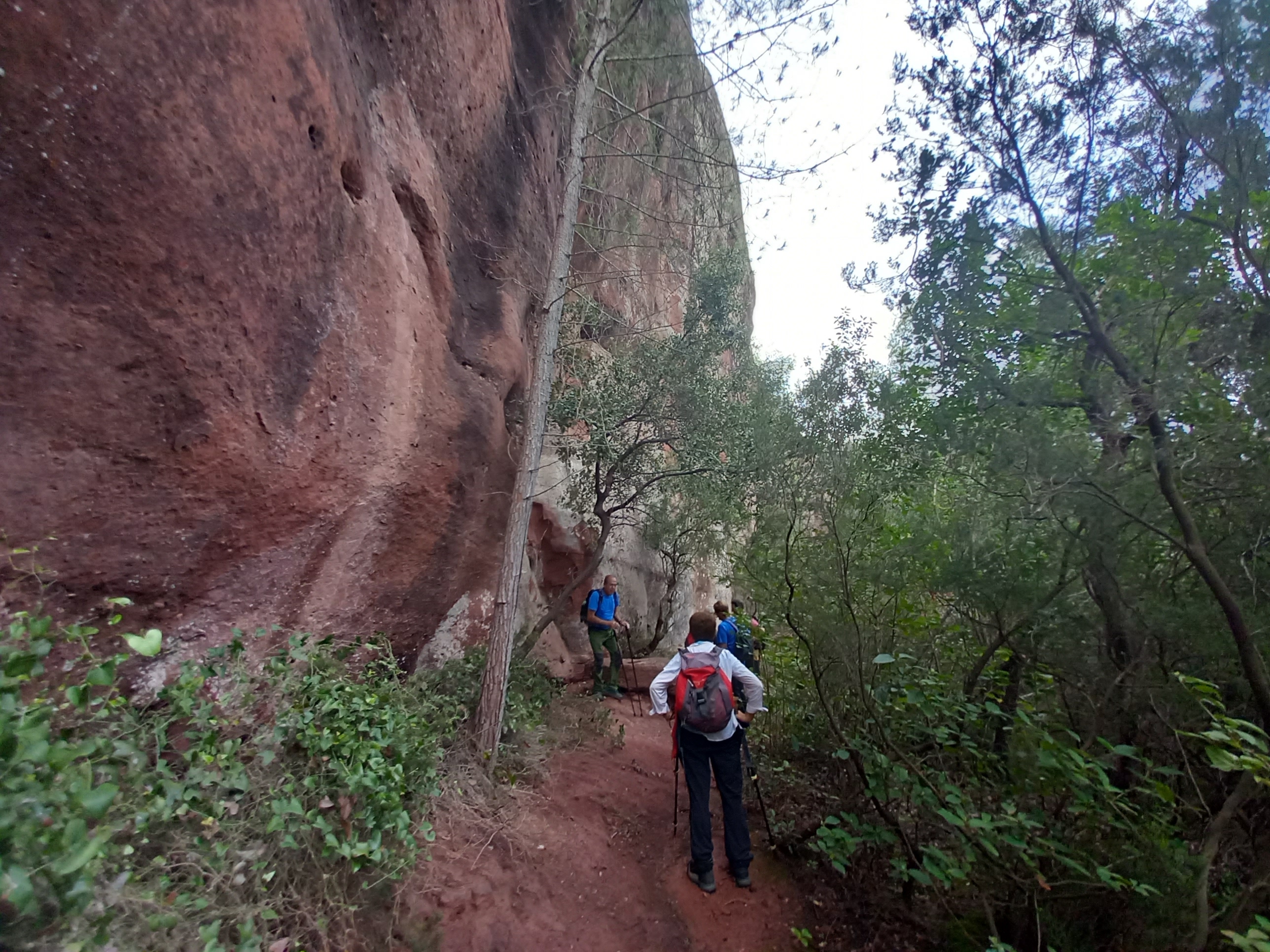 Aquest sender, en 300 m. ens porta a tocar de la Roca del Corb, lloc on trobarem un sender a la dreta, que baixa a passar pels peus de la Roca del Corb, anem una estona pels peus d’una paret vertical de roca,
