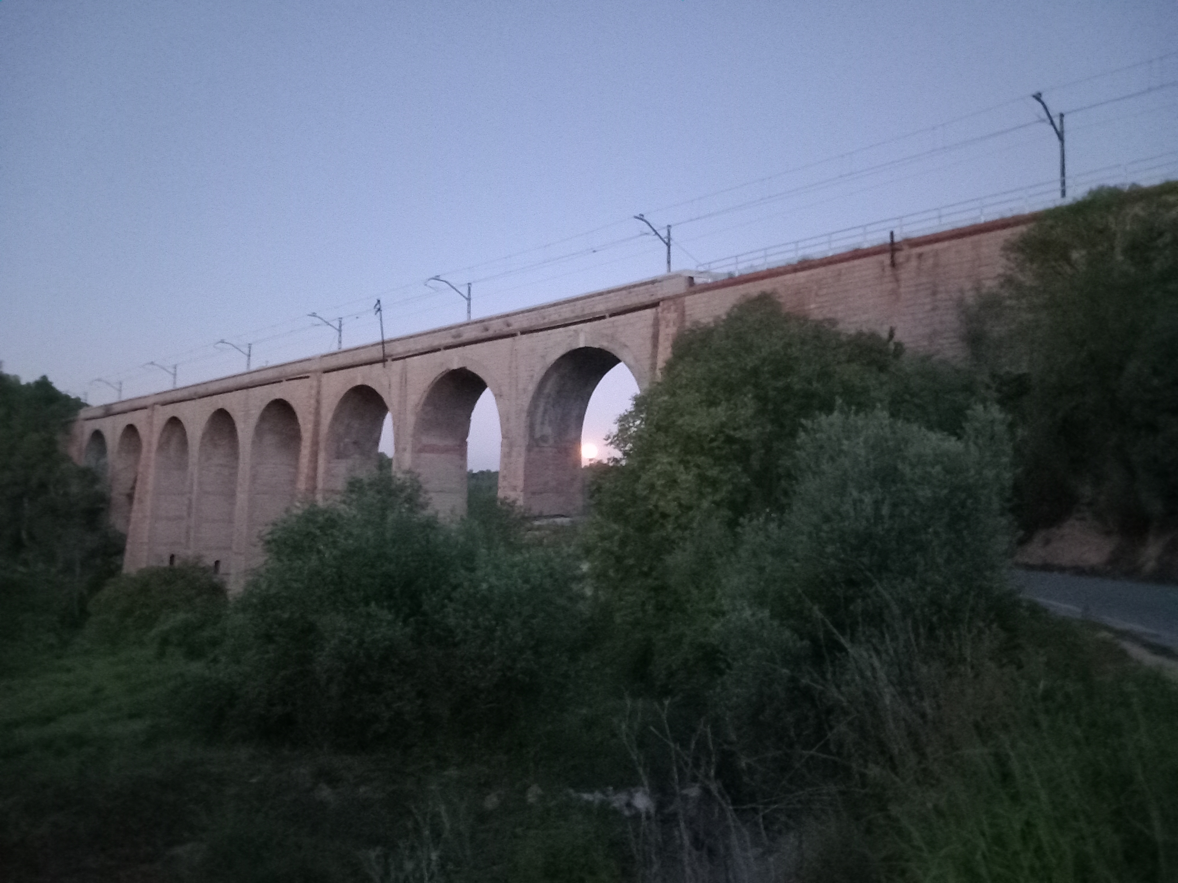 Caminarem una bona estona entre conreus, uns 2,7 km., fins arribar al pont del tren, el camí passa per sota de la primera arcada, seguirem 300 m. pel camí per arribar al punt de sortida.