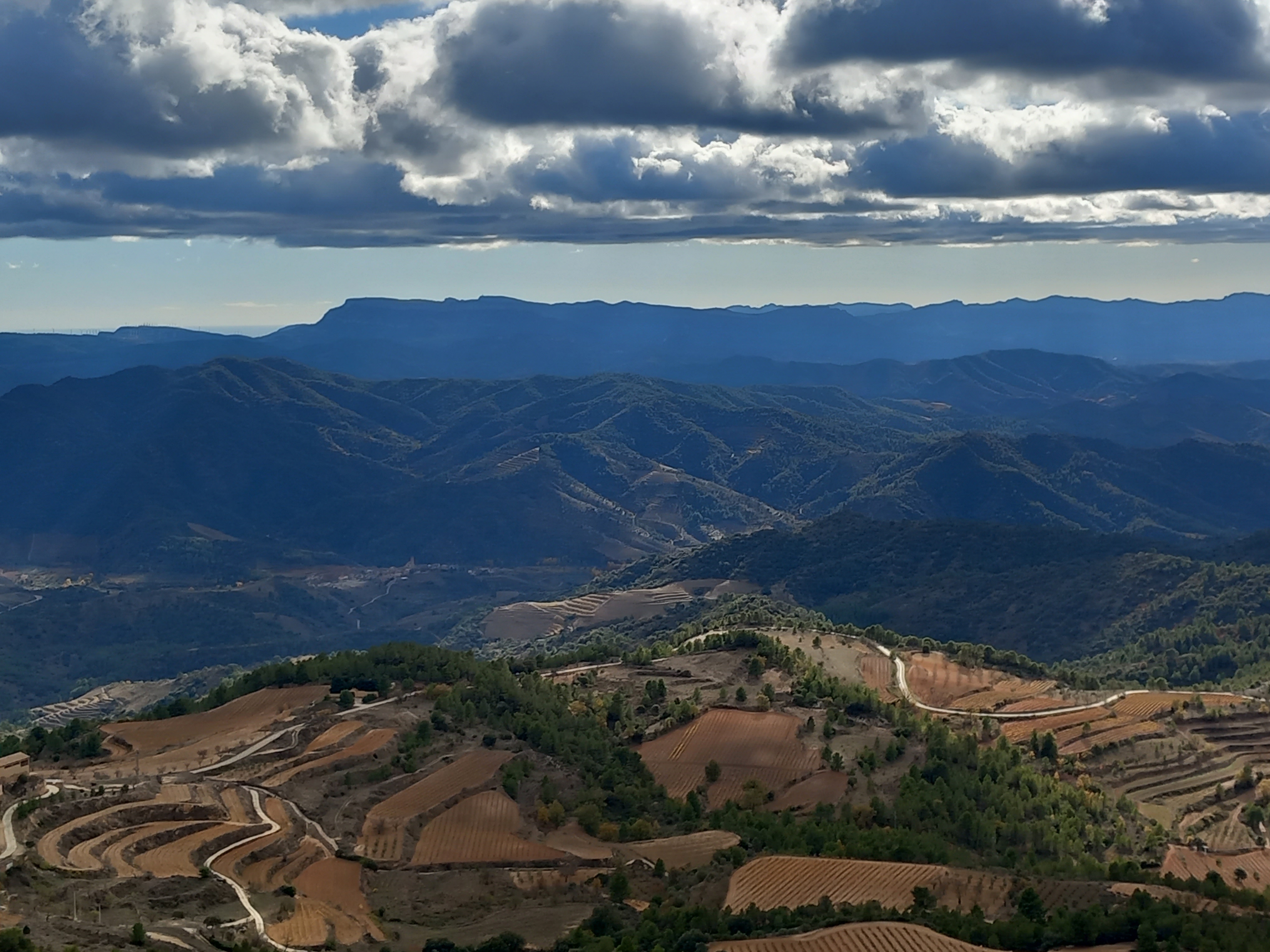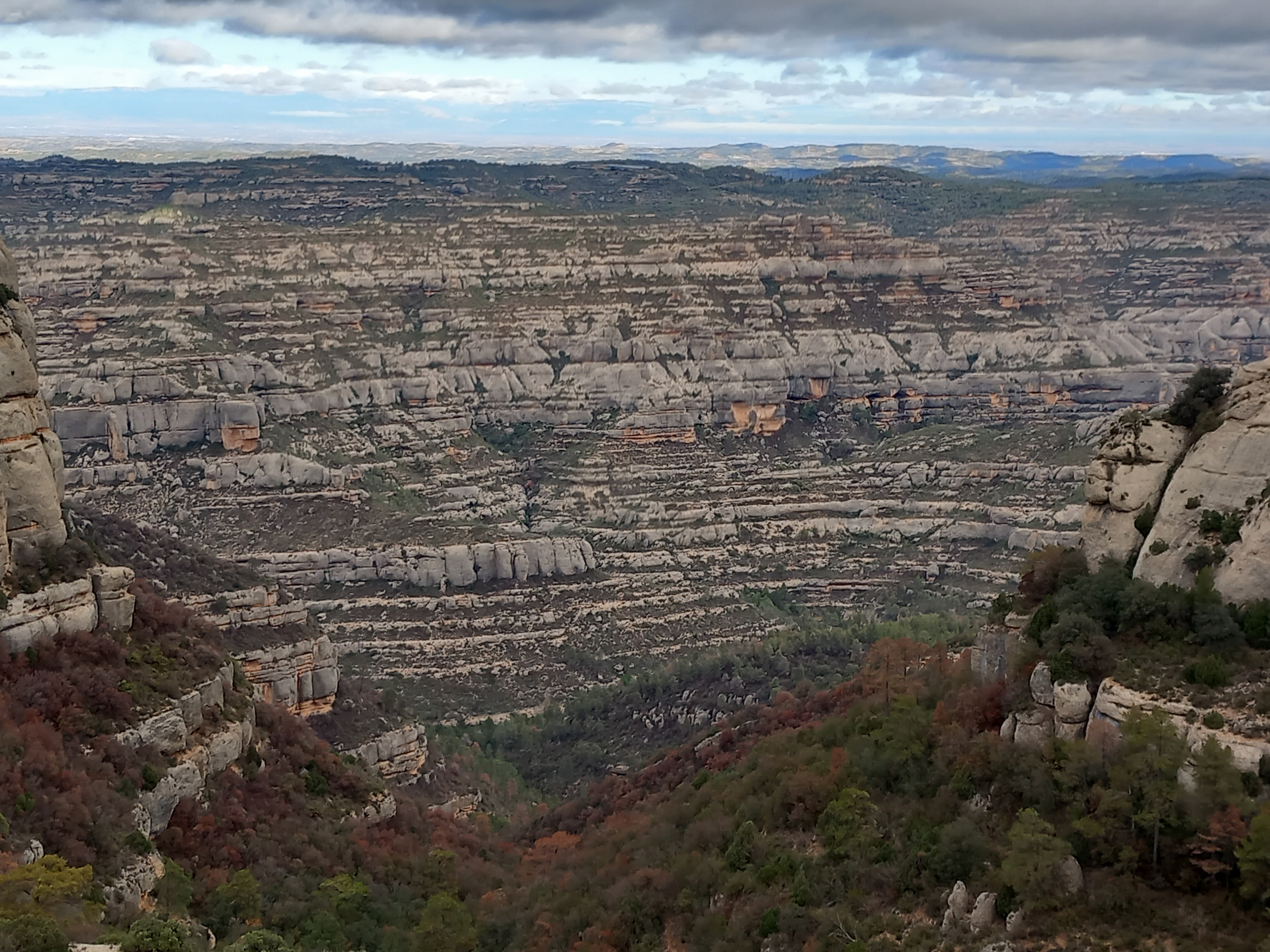 A partir de la cova de l’Arnalla el sender ja no va pel mig del barranc, ho fa per la vessant esquerra (tal com baixem), anem uns 800 m. per aquesta vessant, mentre el barranc s’enfonsa més i més a la nostra dreta, fins el punt on trobaren un sender a la dreta, som a sota del Molló Alt, abans de baixar pareu per admirar el que tenim davant nostre, una vista aèria dels Ventadors, de la zona de Sant Bartomeu i del Riu Montsant per badar una bona estona.
