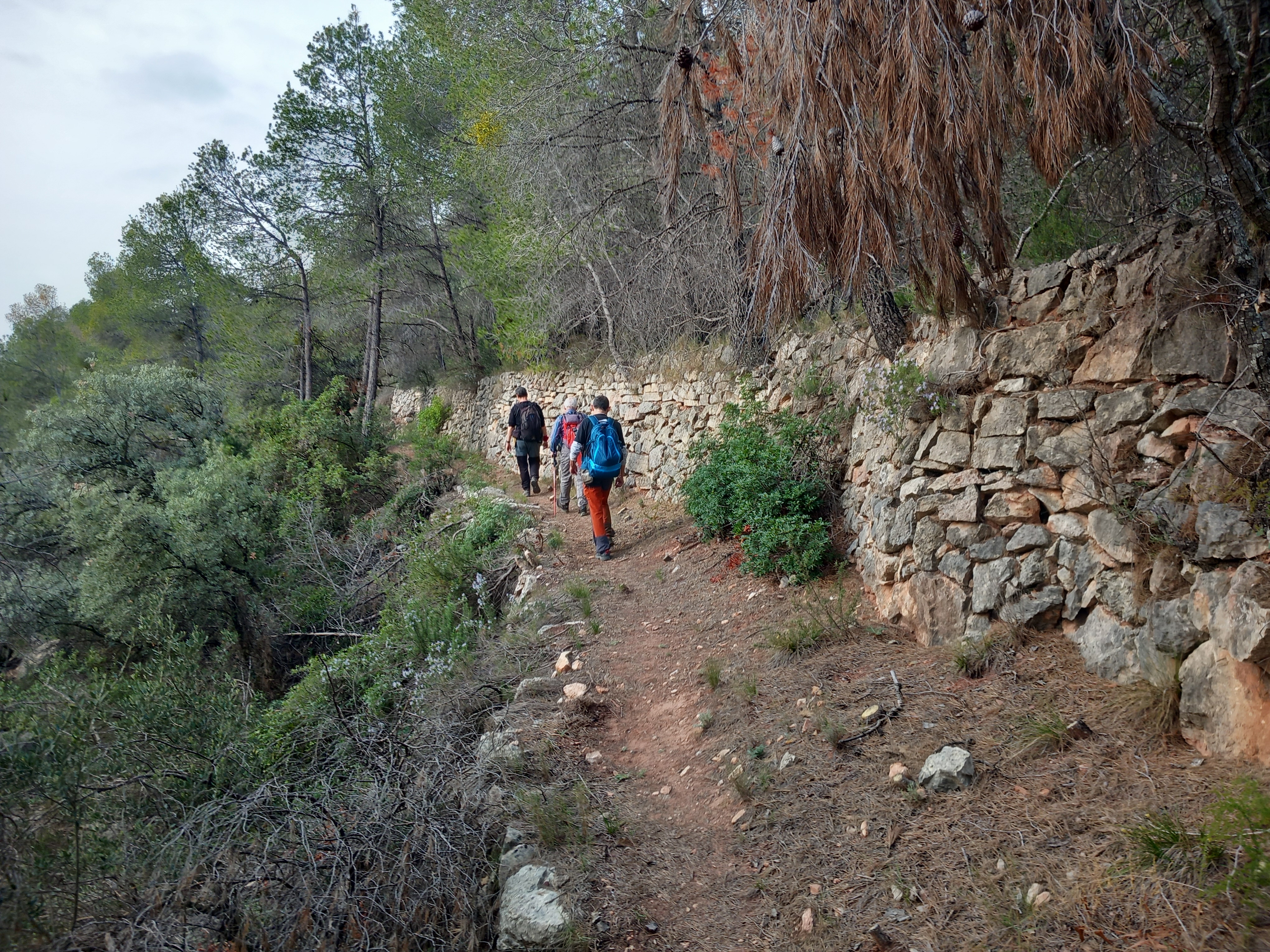 Passats 450 m., en un tros d’olivers, comença un sender, pel que pugem durant 600 m., fins trobar una cruïlla amb 4 camins, agafarem el segon per l’esquerra, l’únic que fa pujada, pel que anirem uns 300 m., per deixar-lo agafant un sender, sense senyalitzar, a la dreta, és un antic camí de bast, amb les seves “infraestructures” marges, empedrats, aigüeres,…, una veritable obra d’enginyeria rural, és l’antic camí del Lloar a Cabacés.