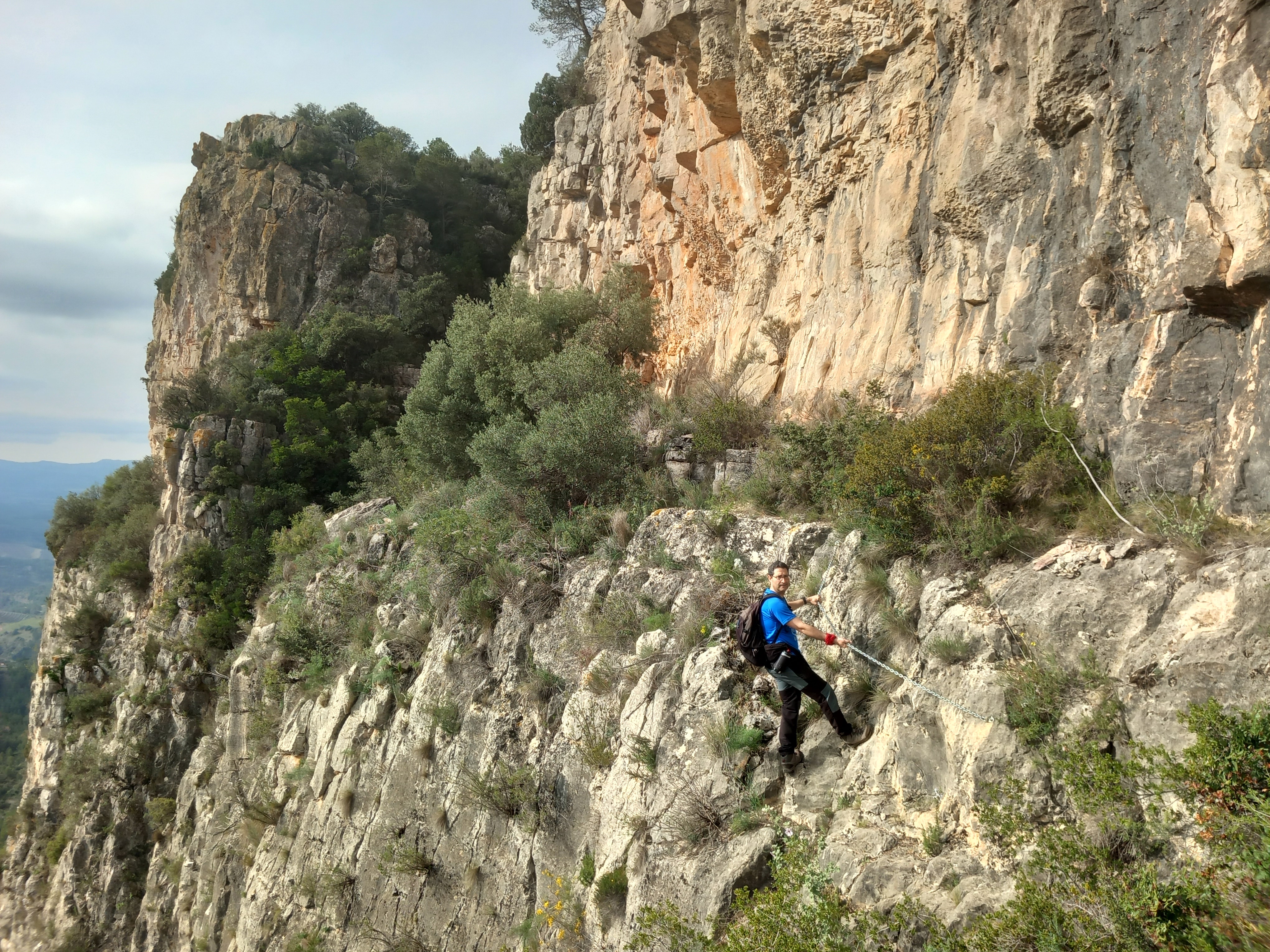 Ens apropem a la paret, el sender es transforma en esgraons, arribem a un balcó on ja es comença a obrir un paisatge indescriptible, des d’aquí marxem a l’esquerra per un sender penjat, equipat en algun punt, fins a una canal, el grau del Pi, que ens deixarà a sobre del cingle.
