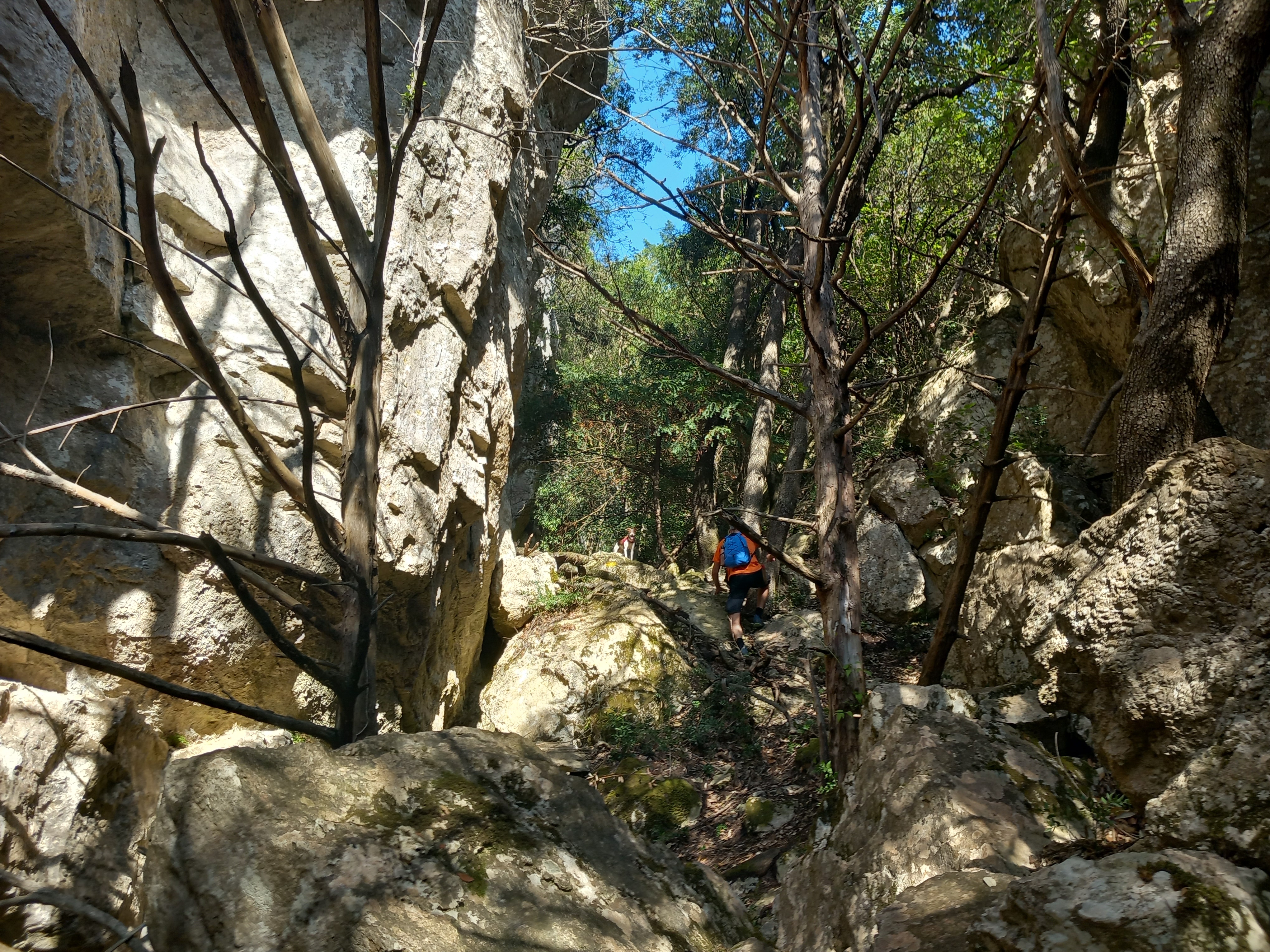 Seguim pel sender, ara fa pujades i baixades, esquivant cingles de roca, al cap de 400 m., entrem a la Rasa dels Teixos, per la que pugem sentint-nos com a formigues dins una esquerda.