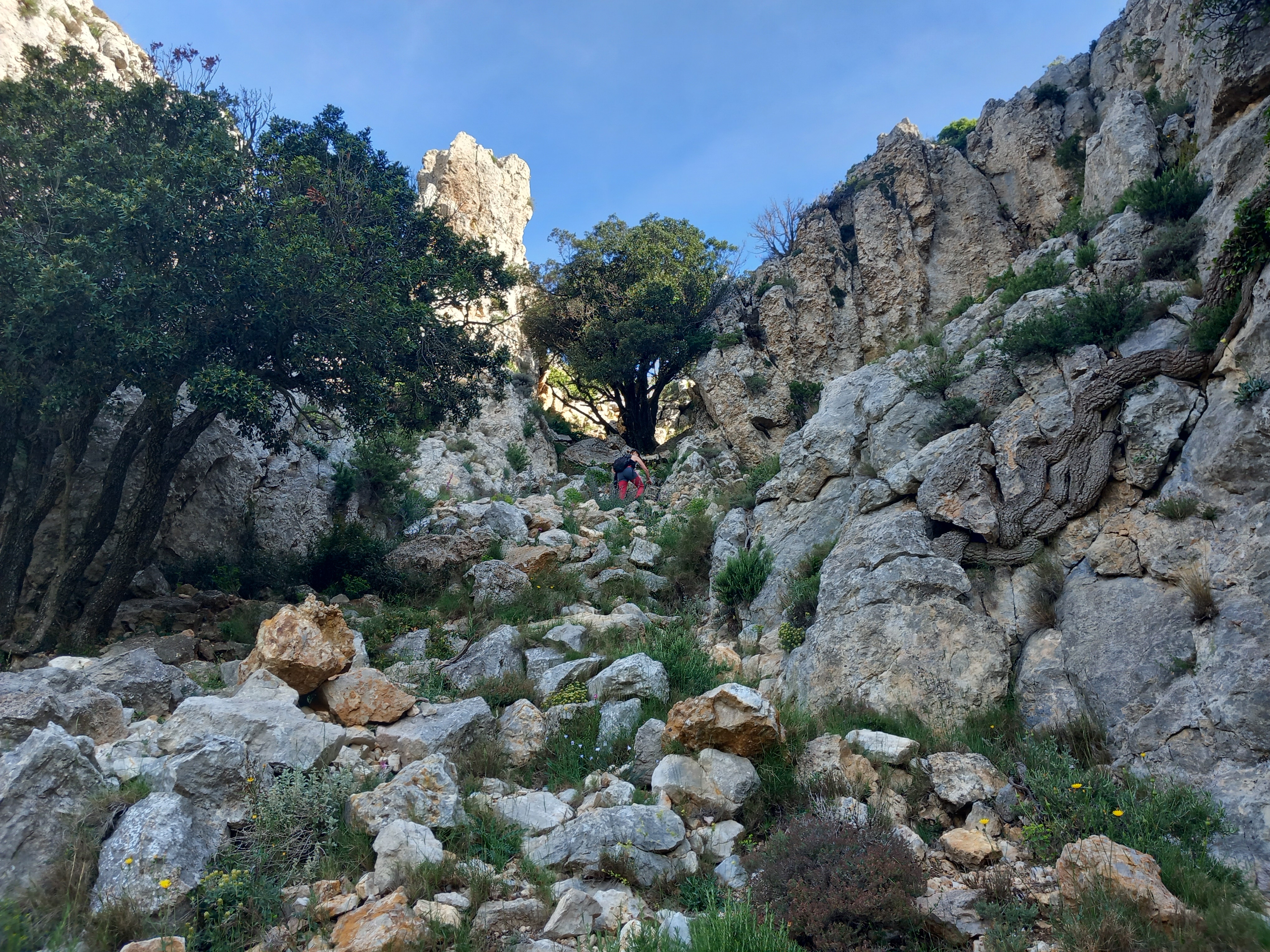 Ara seguim recte, uns 250 m., fins on trobarem un sender a l’esquerra (sense cap senyalització), just a sota de la Punta de Baix de la Mola, l’agafem, el sender comença a baixar, direcció sud, passarem per sota de l’Ull de Bou, un gran forat a la paret del cingle de la Mola, al cap d’1 km. d’anar per aquest sender, agafarem un sender, a l’esquerra, al nord, vigileu que no està senyalitzat, molt poc transitat, hem de pujar a buscar el cingle, passarem per sota d’unes alzines, trobarem la tartera que ens marca l’inici de la Canal dels Clavellers, pugem per aquesta canal.
