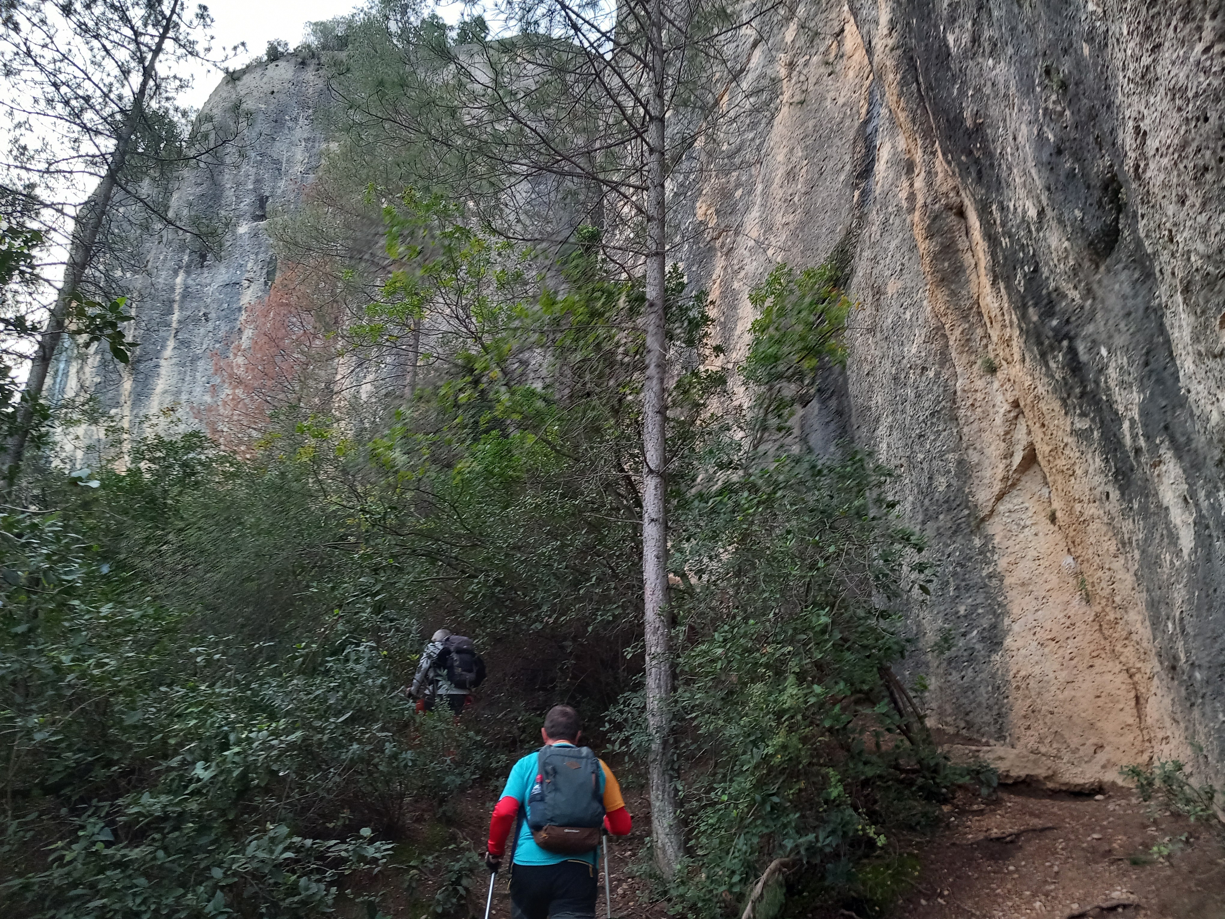 una canal, salvant un bon desnivell, seguirem pujant per la banda de la Coma Closa, amb unes bones vistes del racó de la coma Closa (vol dir barranc tancat, però s’hauria de dir barranc murallat), aviat trobarem el Grau de les Figueres, un cop superat tindrem una bona vista de la zona de l’embassament, ja som a la Rovellosa, seguirem pujant pel sender, fins que en arribar al Grau de la Rovellosa, perdreu el sender, ja que us trobareu davant d’un cingle impossible de salvar, a sota es veu el sender, haureu de tornar uns 20 m. i baixar per un pas complicat però curt, hi ha una corda que us ajudarà a baixar.