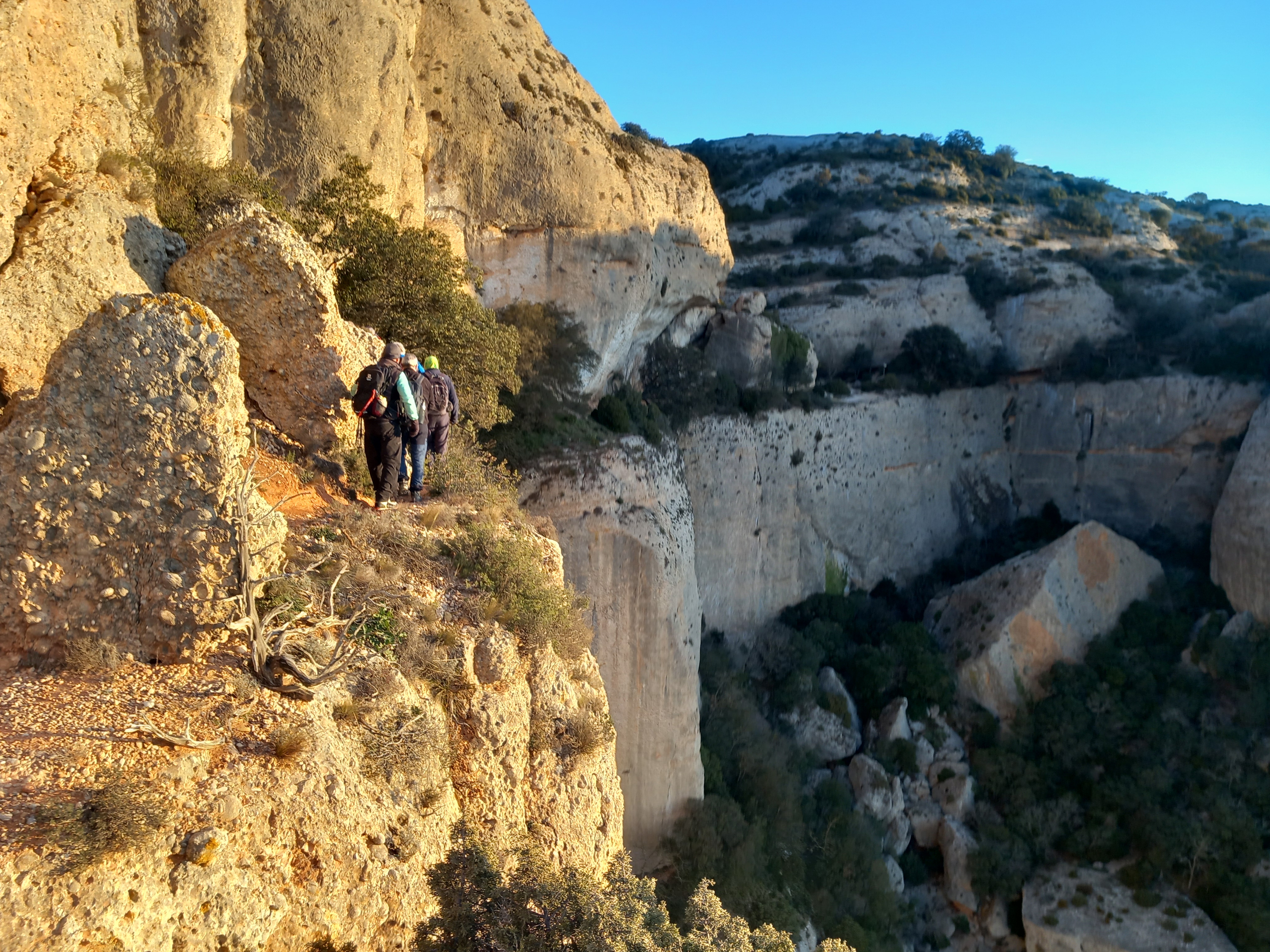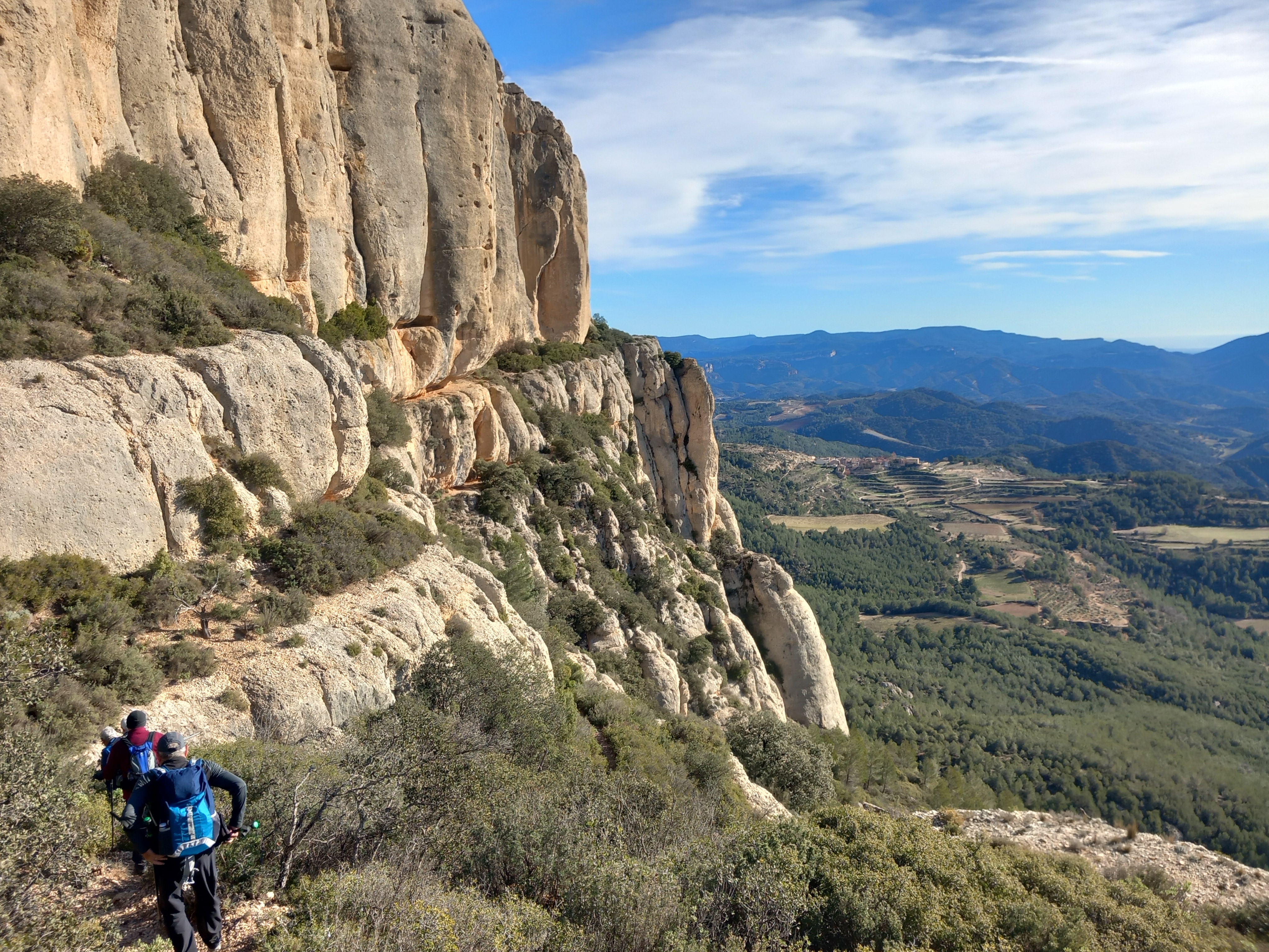 Tornem, saltem la roca equipada amb més barrots de ferro, i seguim pel sender, sender aeri, amb magnífiques vistes, aneu amb precaució. Arribarem a la Roca de les Onze, un passamà ens ajuda a sortir al Balcó del Priorat, un altre espectacle.