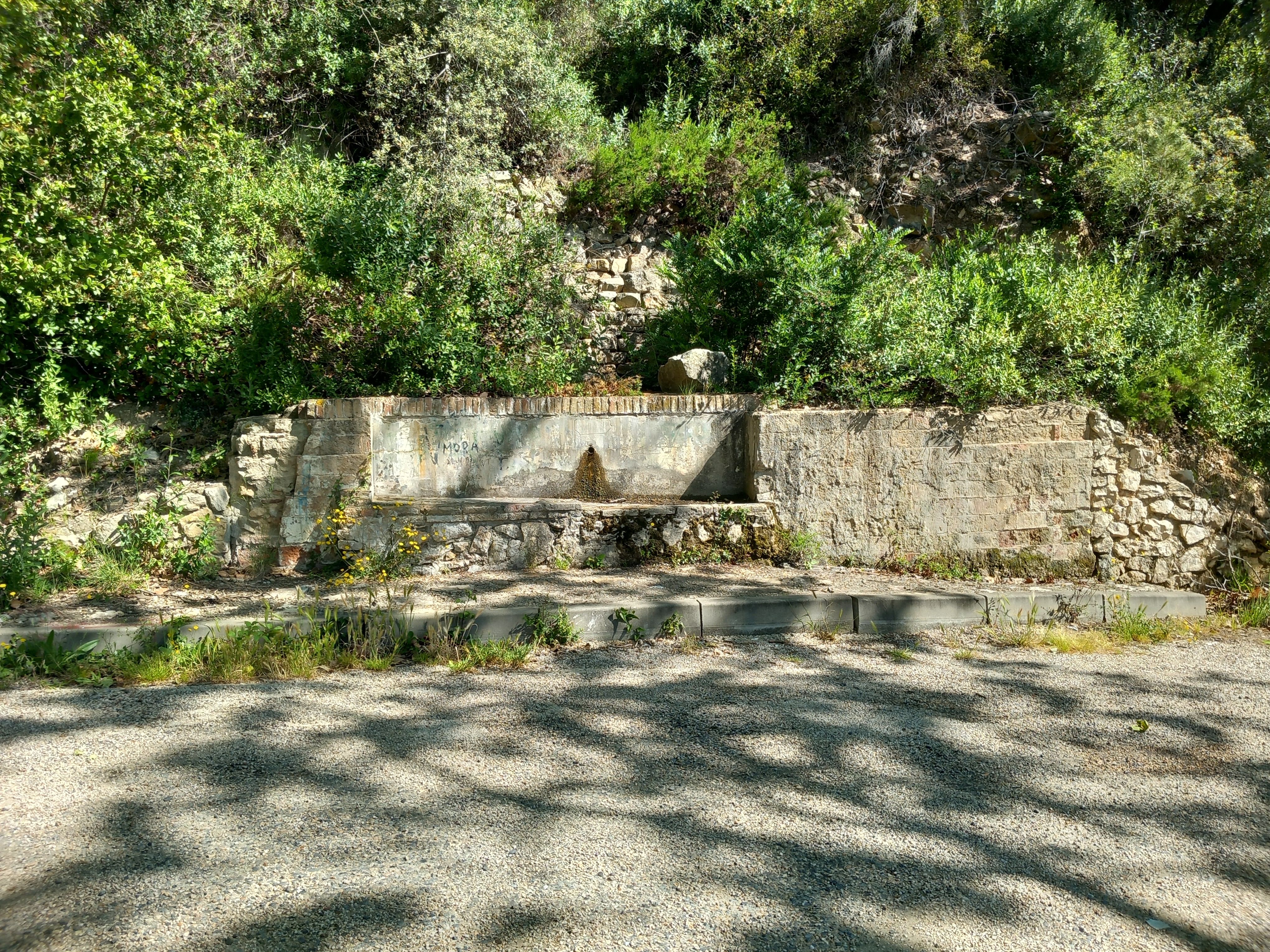 Ara agafem un sender direcció sud, baixem uns 100 m. girant cap a l’esquerra , fins arribar a una petita canal per la que hem de baixar, un cop baix, girem a la dreta per un sender, pel que en 50 m. arribem a la cova de l’Arbonès i la cova de la Paparra, són cavitats funeràries calcolítiques excavades fa 50 anys, on, entre altres restes, es va trobar un punyal de llengüeta de coure. Seguim pel sender uns 200 m. fins arribar a un camí, que agafem a l’esquerra, passats pocs metres passarem per la Caseta del Maco, passats 300 m., prop d’on hem passat abans baixant del camí de les Quimeres, agafem el sender a l’esquerra, on trobarem una bassa d’aigua de secció rectangular amb parets de pedra seca, prop hi ha un pou de secció el·líptica. Per aquest sender en 300 m., arribarem a un tram de l’antiga N420, a l’alçada de la Font de Pradell, de parada obligada als anys 60, 70 i 80 per refrescar-se i airejar-se del mareig que portaves a causa de la sinuosa carretera.