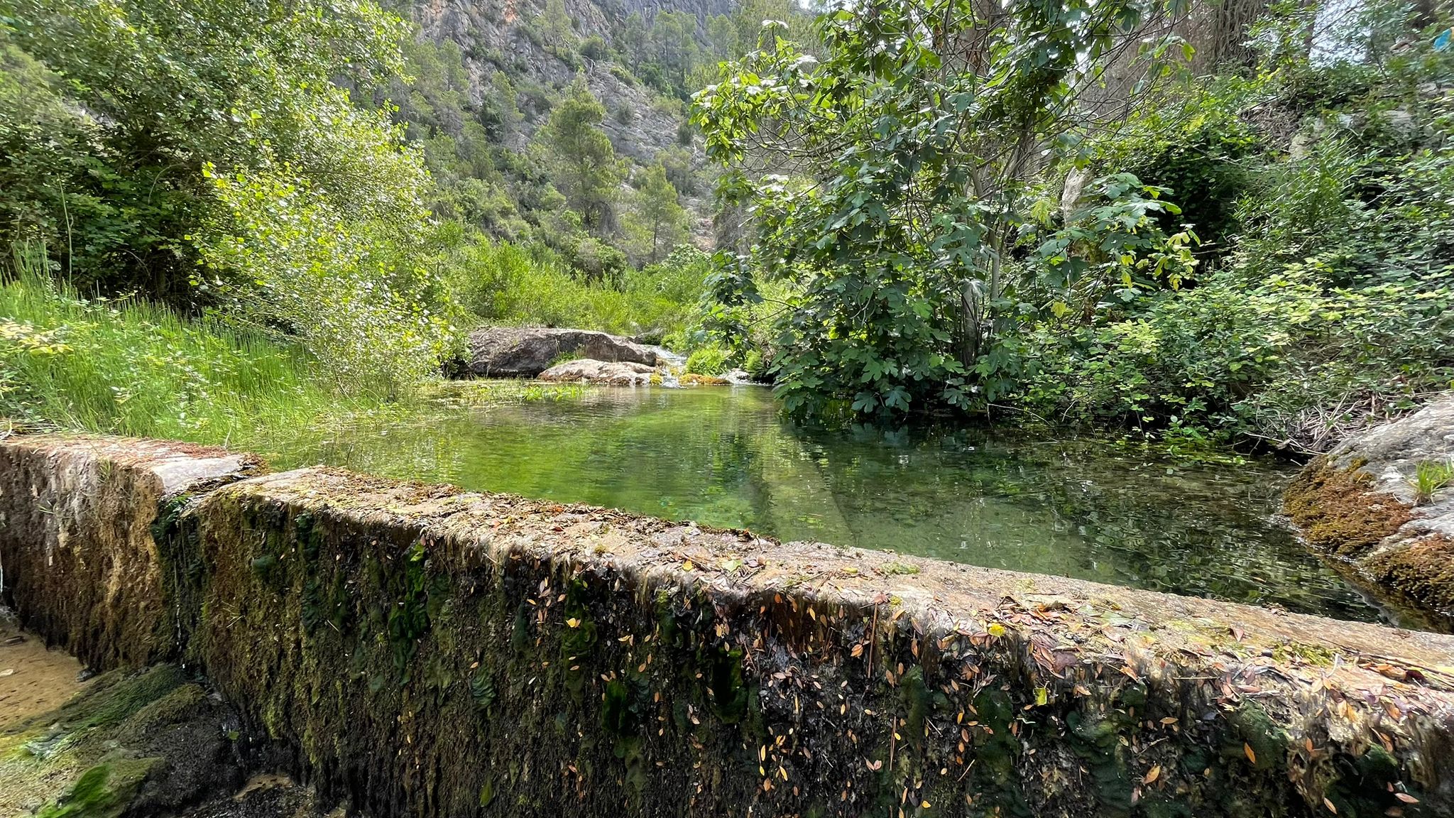 Per aquest camí hi anirem no més de 100 m., fins trobar un sender a l’esquerra on diu “Lo Teix Milenari”, al cap de 300 m. hi ha una planeta amb vegetació de zones humides, és la Font del Curtet, on hi ha una bona vista sobre el cingle, amb el mas del Ramer als peus.