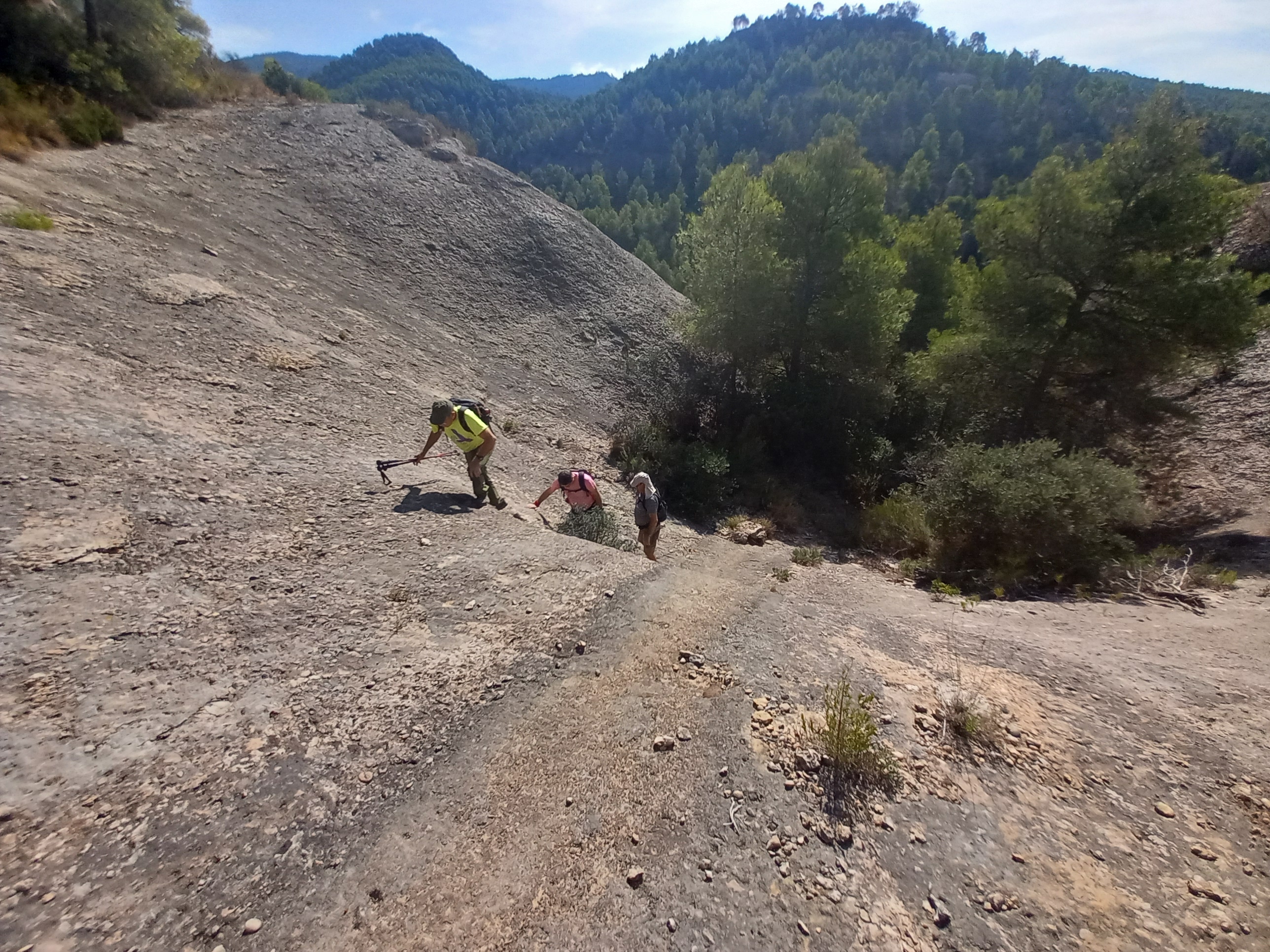 on agafarem el sender a l’esquerra, passats 100 m., trobarem un corral de pedra seca. Seguim pel sender fins trobar una roca en forma d’embut per la que pujarem per Los Escalons,